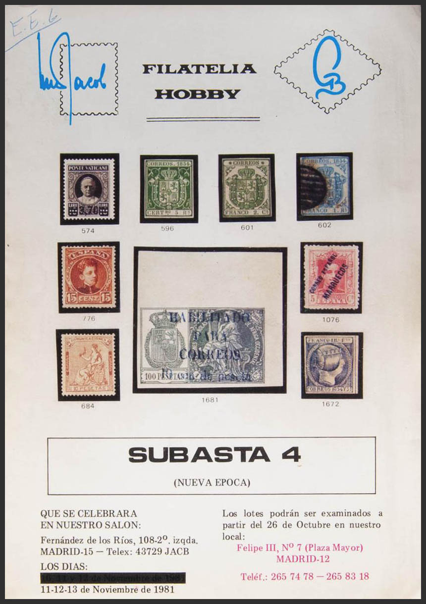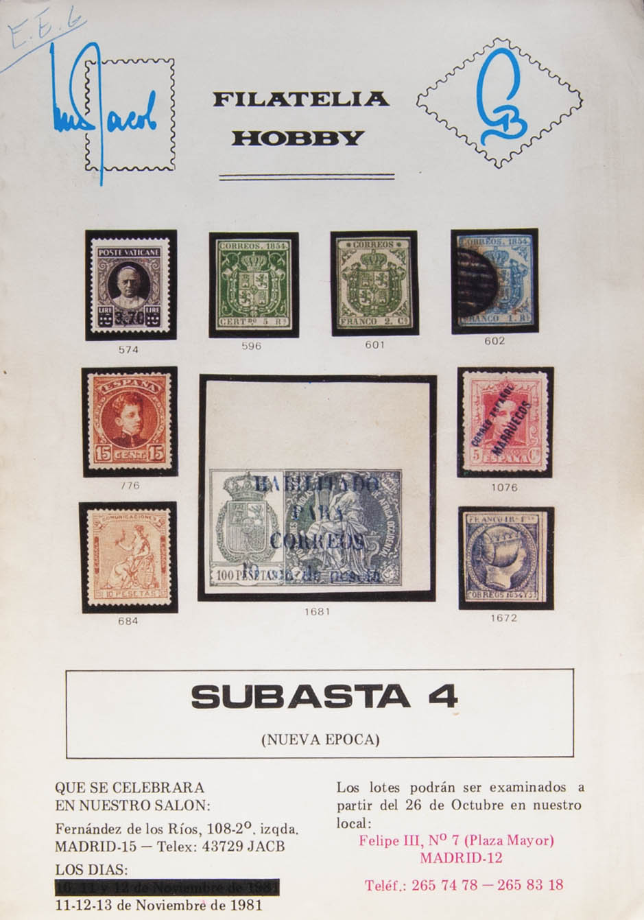 1981. Catálogo de subasta de Filatelia organizada por Hobby del 11 al 13 de Noviembre de 1981 (Nº4). Madrid, 1981.