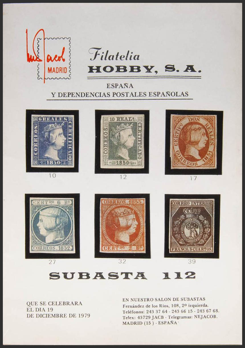 1979. Catálogo de subasta de Filatelia de España organizada por Hobby el 19 Diciembre de 1979 (Nº112). Madrid, 1979.