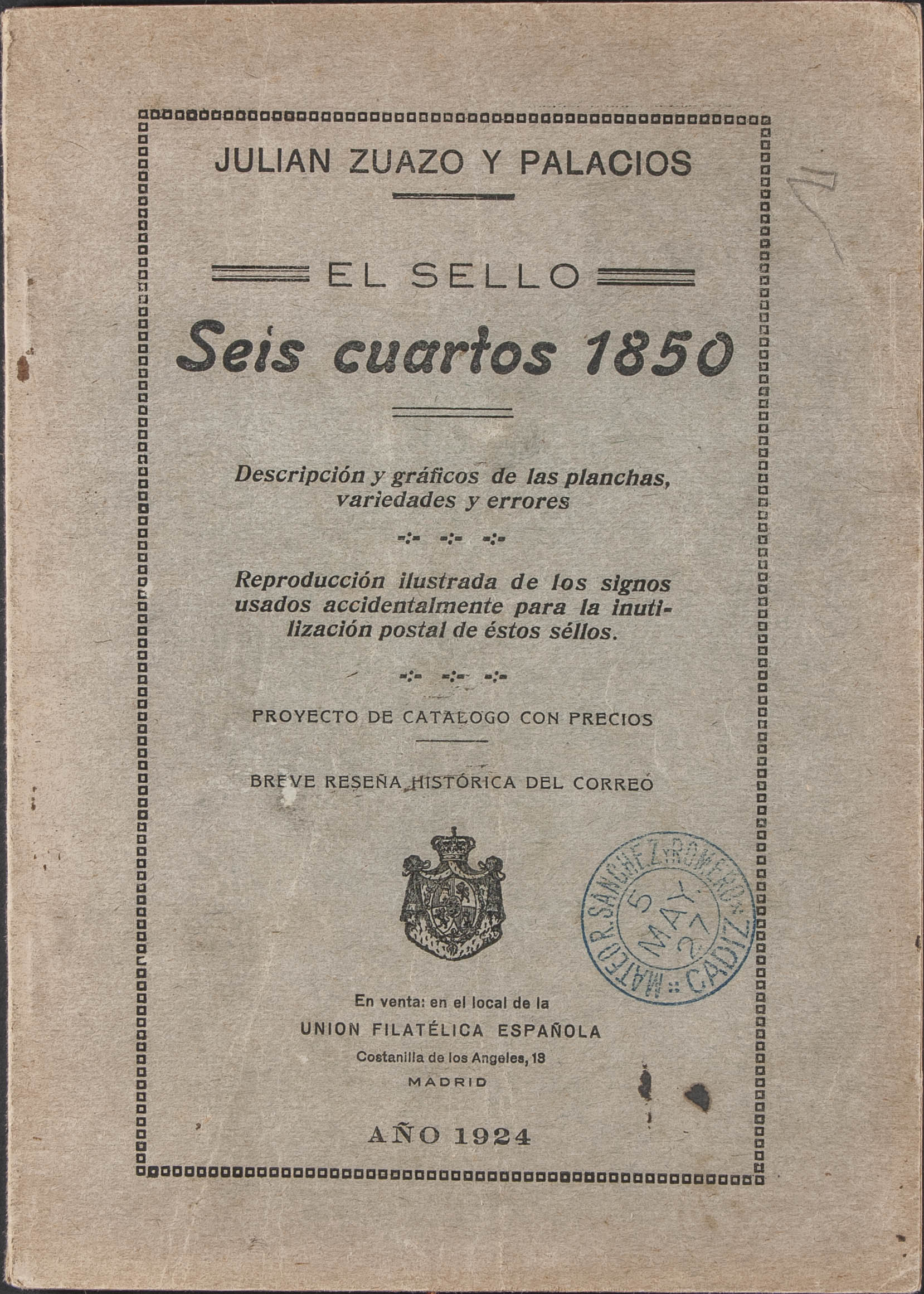 1924. EL SELLO 6 CUARTOS 1850. Julián Zuazo y Palacios. Unión Filatélica Española. Madrid, 1924.