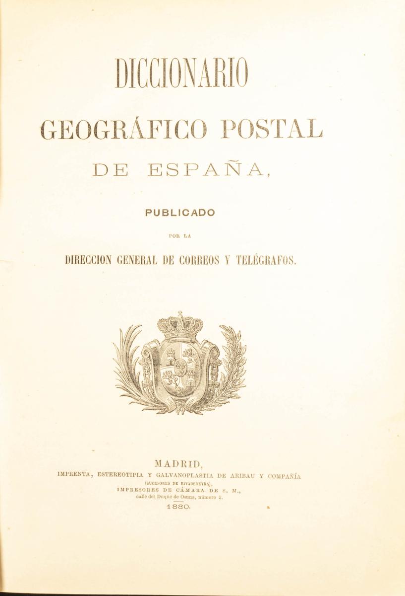 1880. DICCIONARIO GEOGRAFICO POSTAL DE ESPAÑA. Dirección General de Correos y Telégrafos. Madrid, 1880.