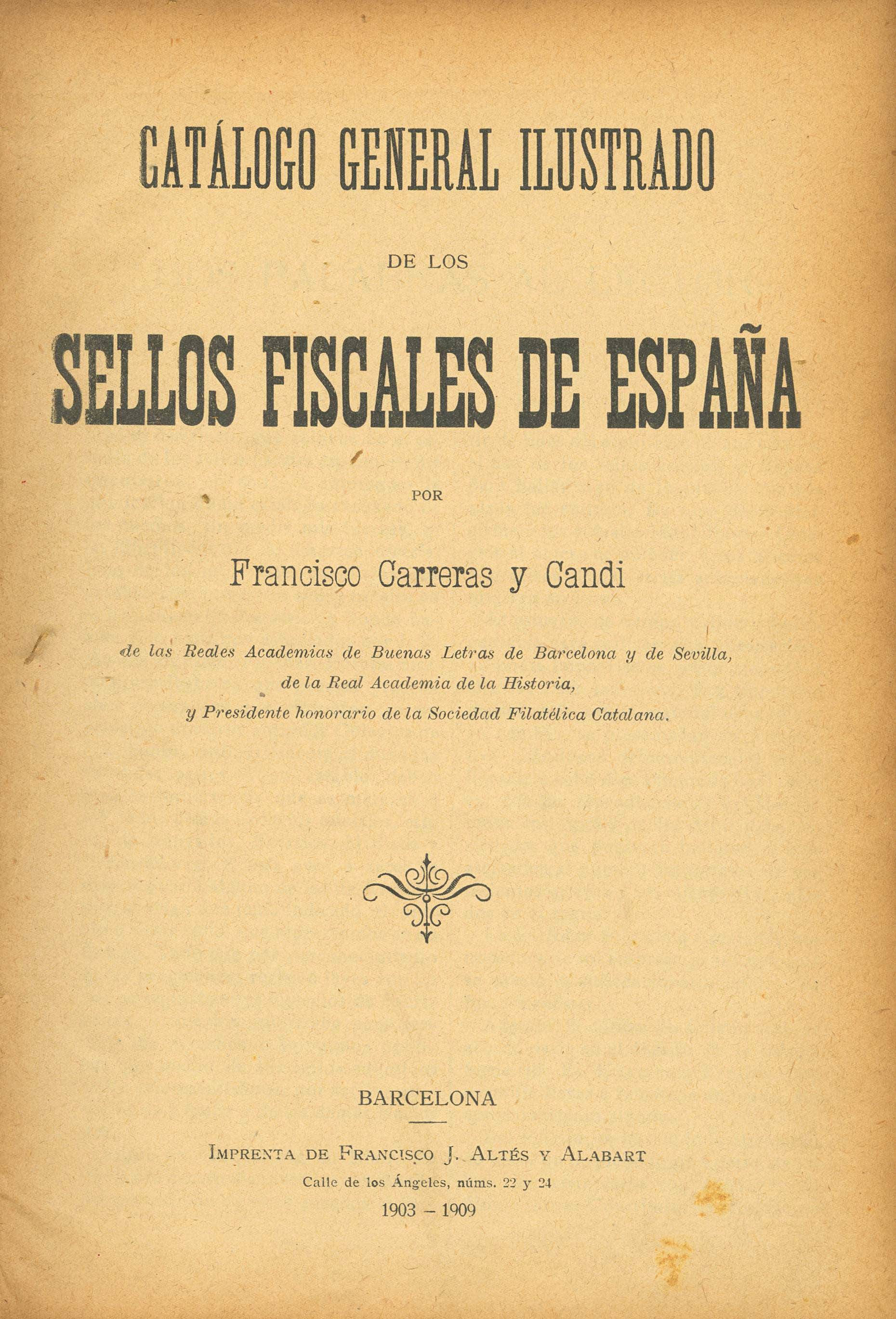 1909. CATALOGO GENERAL DE LOS SELLOS FISCALES DE ESPAÑA. Francisco Carreras y Candi. Barcelona, 1909. (ligeramente fatigado)