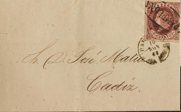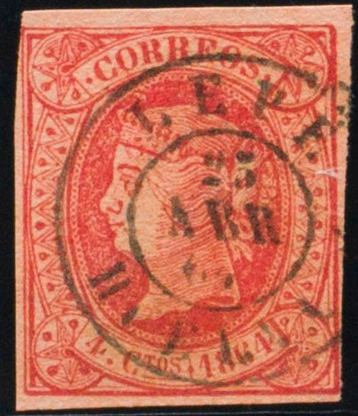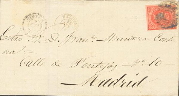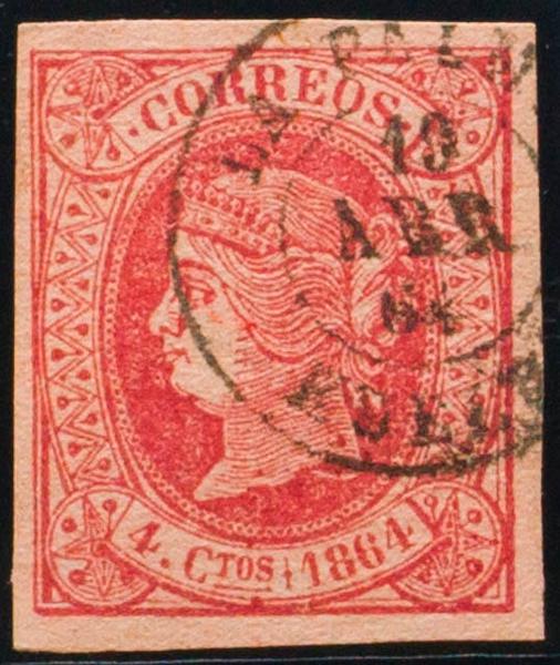 64. 1864. 4 cuartos rojo, borde de hoja. PALAMOS a MADRID. Matasello PALAMOS / GERONA. MAGNIFICA Y RARA. Ex-Tizón.