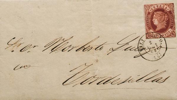64. 1864. 4 cuartos salmón. SANTA MARTA a SEVILLA. Matasello R. CARRETA MUDO, de Santa Marta, ligero doblez horizontal. MAGNIFICA Y RARISIMA, NO MAS DE TRES O CUATRO CONOCIDAS.