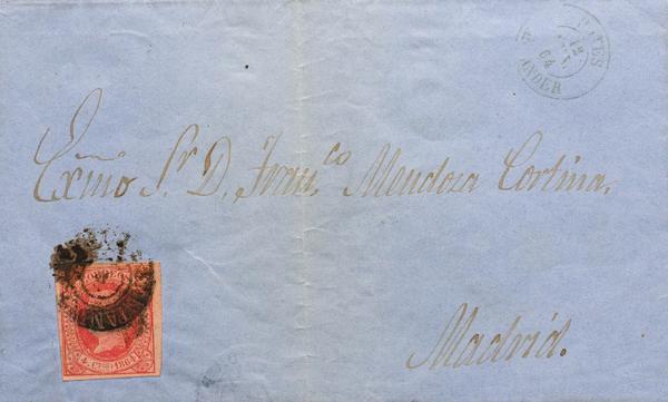 64. 1864. 4 cuartos rojo. MADRID a ARROYO DEL PUERCO. Matasello mixto PARRILLA CON Nº1 y fechador MADRID / (1). MAGNIFICA Y RARA.