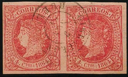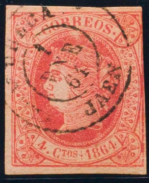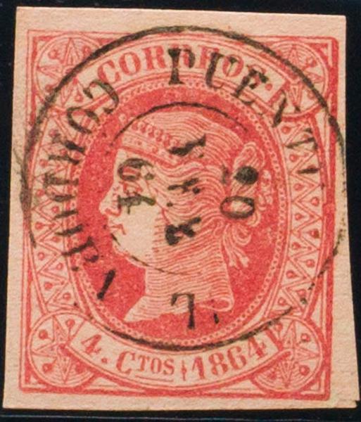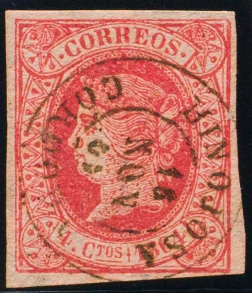64. 1864. 4 cuartos rojo. PUENTE DE JUBIA a ORTIGUEIRA. Matasello prefilatélico GALICIA / PTE. DE JUBIA. MAGNIFICA Y MUY RARA, ESPECIALMENTE CON ESTA EXCEPCIONAL ESTAMPACION. Cert. COMEX.