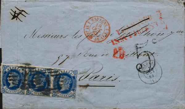 64(3). 1864. 4 cuartos rojo, tres sellos. VITORIA a ROUEN (Francia). Matasello R. CARRETA Nº 48. Inusual combinación para completar la tarifa a Francia de 12 cuartos. BONITA.