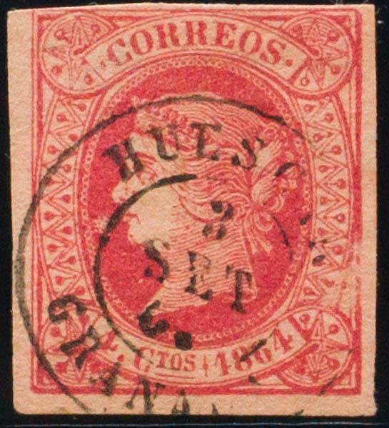 64. 1864. 4 cuartos rojo. SORT a TREMP. Matasello SORT / LERIDA. MAGNIFICA Y RARA. Ex-Tizón.