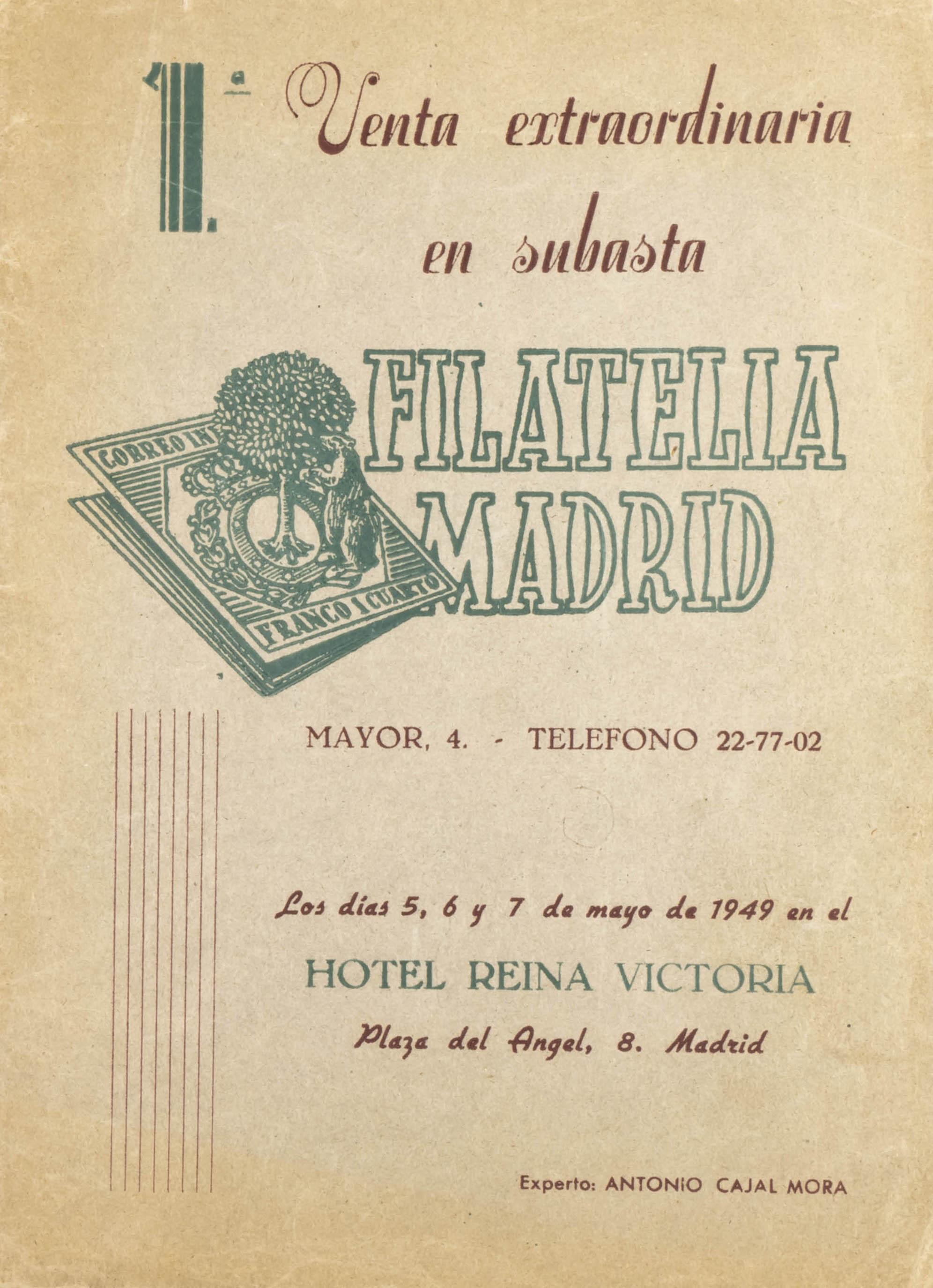 1949. FILATELIA MADRID. 1ª VENTA EXTRAORDINARIA EN SUBASTA. Mayo de 1949. (muy buena conservación). RARISIMO EJEMPLAR.
