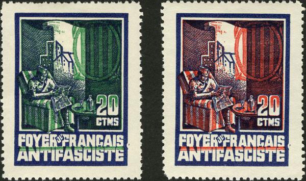 ★1937. 10 cts rojo y 10 cts verde. FOYER DU FRANCAIS ANTIFASCISTE. MAGNIFICAS. (Guillamón 2197/98).