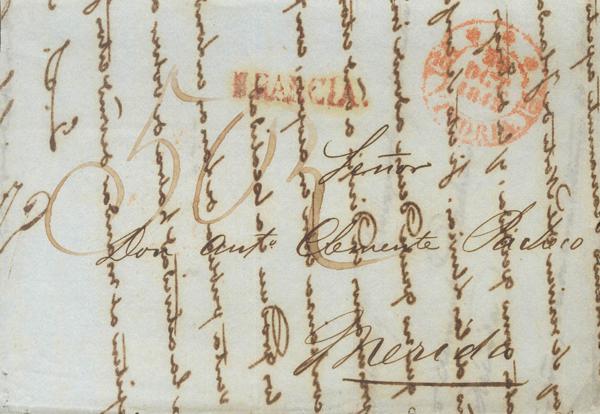1849. VILLAFRANCA DE LOS BARROS (BADAJOZ) a MERIDA. Baeza VILLAFCª D.L.B. / ESTREM B., en rojo. MAGNIFICA.