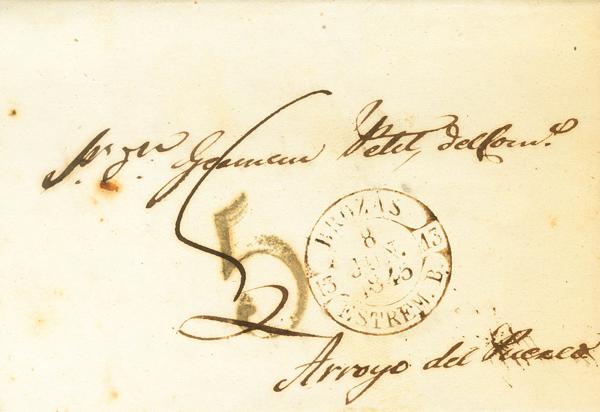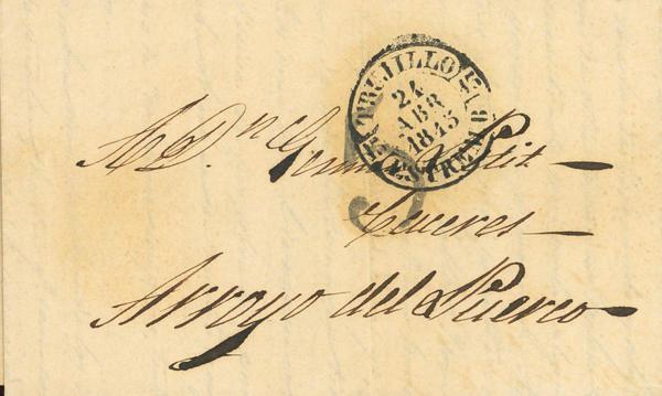 1849. FREGENAL DE LA SIERRA (BADAJOZ) a CACERES. Baeza FREJENAL / ESTREM.B., en rojo. MAGNIFICA Y RARA.