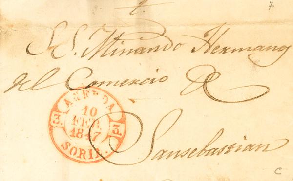 1849. YANGUAS (SORIA) a CORELLA (NAVARRA), reexpedida a PAMPLONA. Baeza *** / SORIA, en rojo. MAGNIFICA.