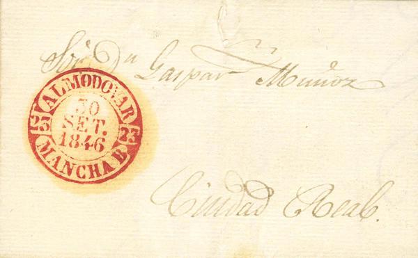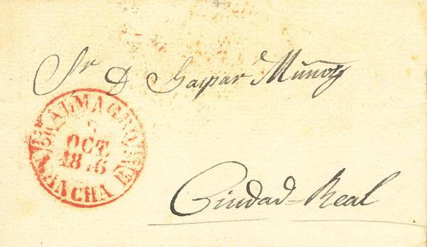 1849. CORRAL DE ALMAGUER (TOLEDO) a ALCALA DE HENARES. Baeza OCAÑA / CAST.LA N, en rojo. MAGNIFICA ESTAMPACION.