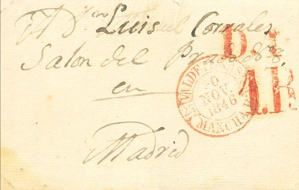 1849. PRIEGO (CUENCA) a ALCALA DE HENARES. Baeza PRIEGO / ALCARRIA, en rojo. MAGNIFICA Y MUY RARA.