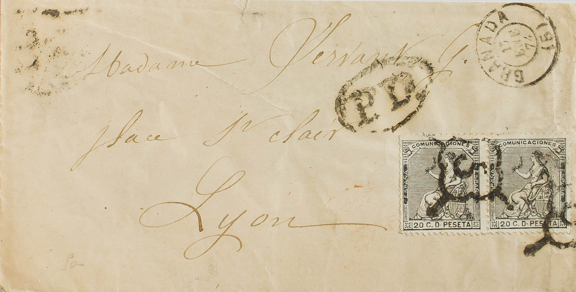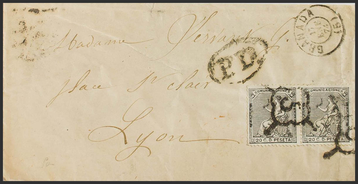 134(2). 1874. 20 cts negro, pareja. GRANADA a LYON (FRANCIA). Matasello ARAÑA Nº5, de Granada. MAGNIFICA Y MUY RARA COMBINACION PARA COMPONER LA TARIFA DE 40 CTS A FRANCIA.