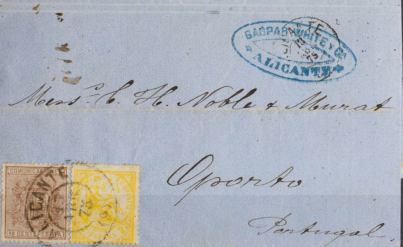 143, 153. 1875. 10 cts y 2 cts ALICANTE a OPORTO (PORTUGAL). Matasello ALICANTE / (9). MAGNIFICO Y RARO DESTINO Y FRANQUEO.