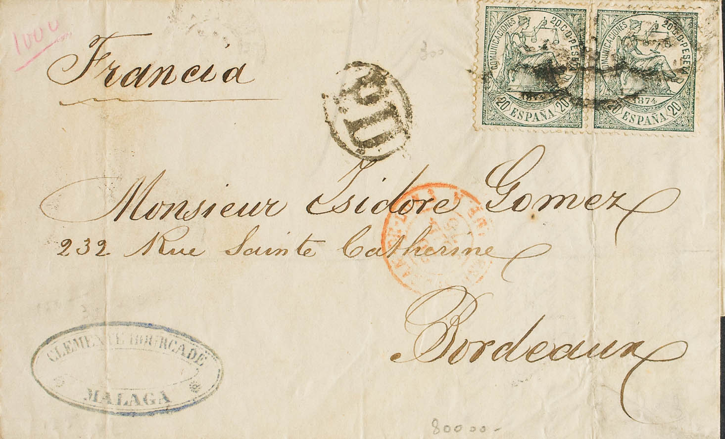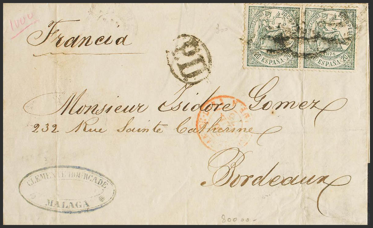 146(2). 1875. 20 cts verde, pareja. MALAGA a BORDEAUX (FRANCIA). MAGNIFICA Y RARISIMA COMBINACION PARA COMPONER CON ESTOS SELLOS LA TARIFA A FRANCIA DE 40 CTS.