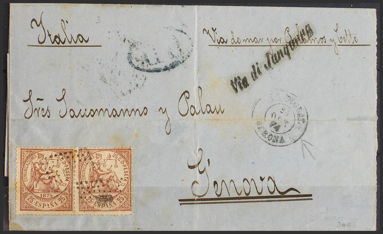 147(2). 1874. 25 cts castaño, pareja. LA BISBAL a GENOVA (ITALIA). MAGNIFICA Y RARO FRANQUEO.