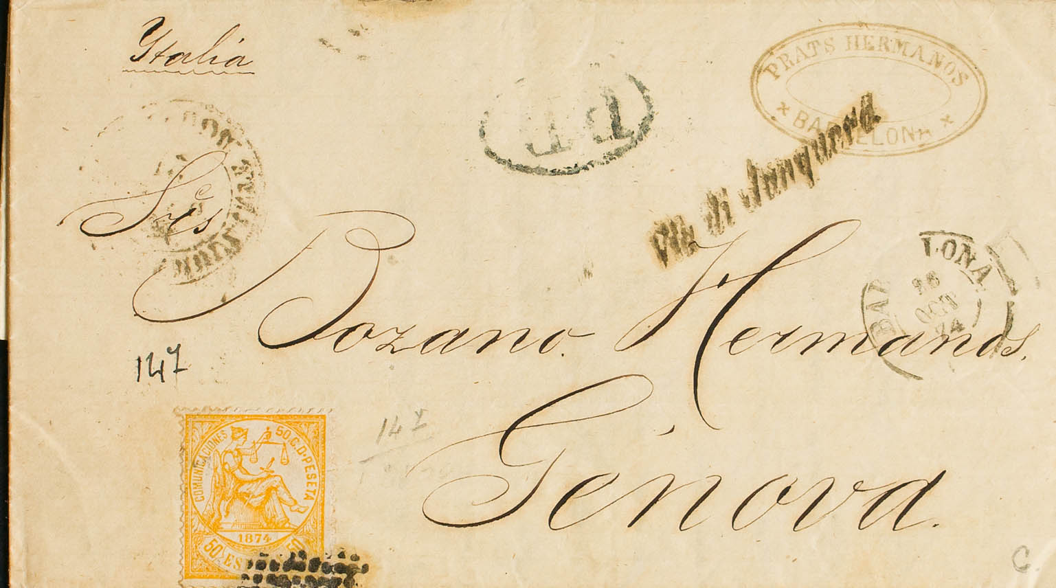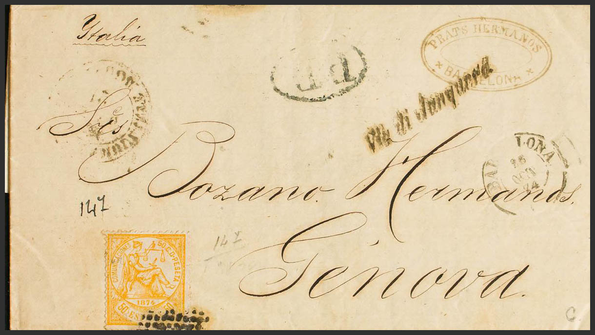 149. . 50 cts amarillo. BARCELONA a GENOVA (ITALIA). En el frente VIA DI JUNQUERA, en cursiva. MAGNIFICA Y RARA.