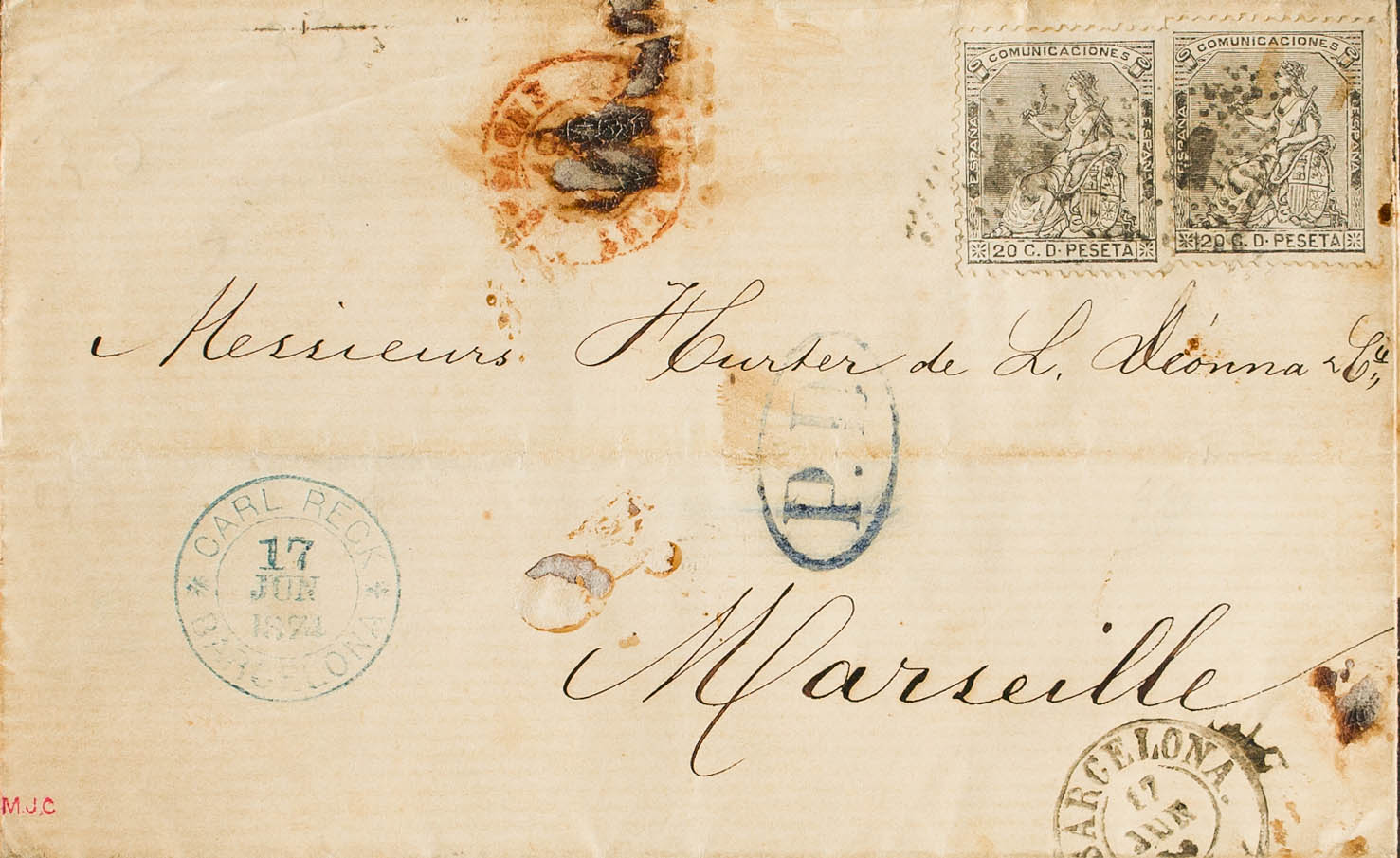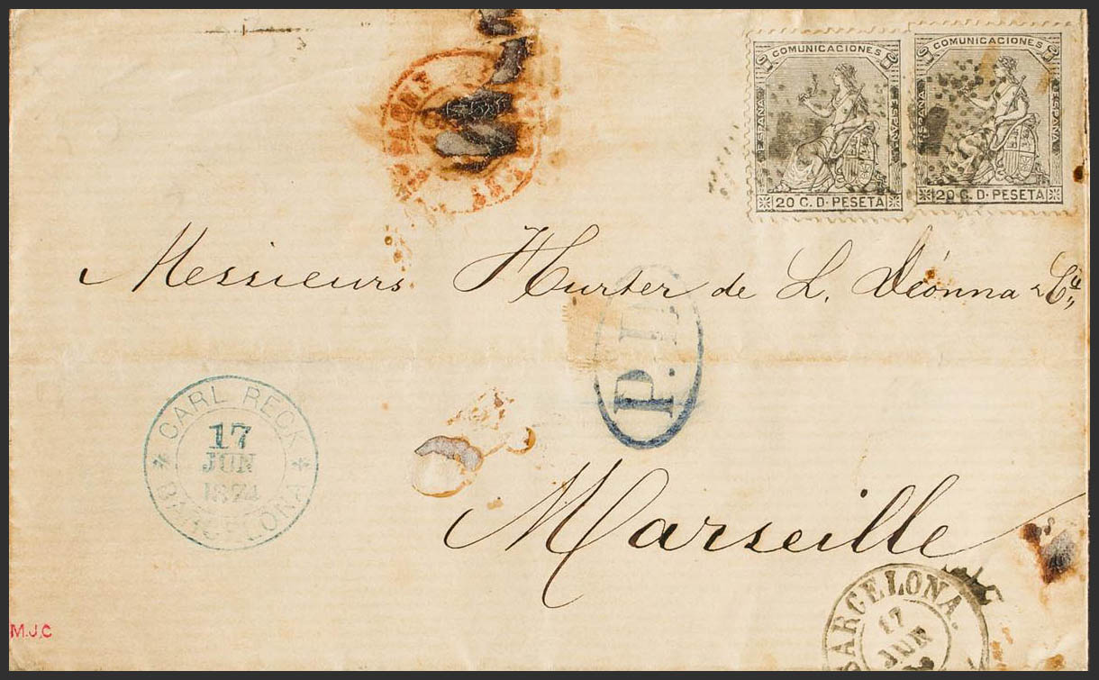 134(2). 1874. 20 cts negro, dos sellos. BARCELONA a MARSELLA (FRANCIA). MAGNIFICA Y RARA COMBINACION PARA COMPLETAR LA TARIFA DE 40 CTS.