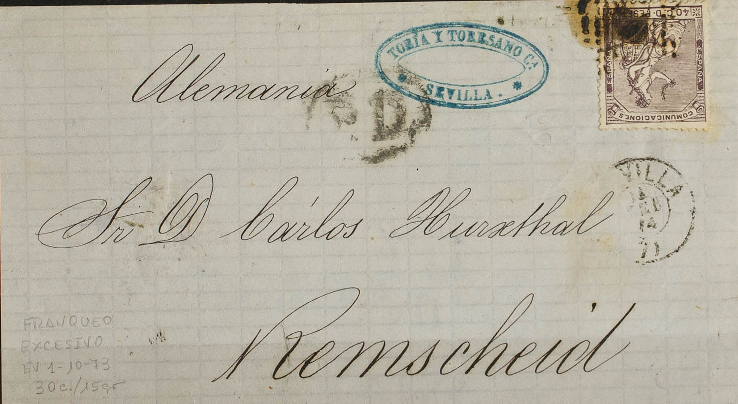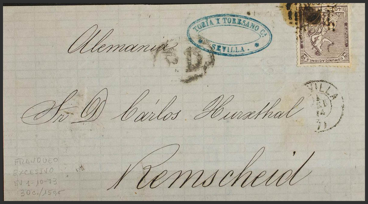 136. 1874. 40 cts castaño. Frontal de SEVILLA a REMSCHEID. Franqueo con 10 cts de exceso según tarifa a Alemania de Octubre de 1872. MAGNIFICA Y RARA.
