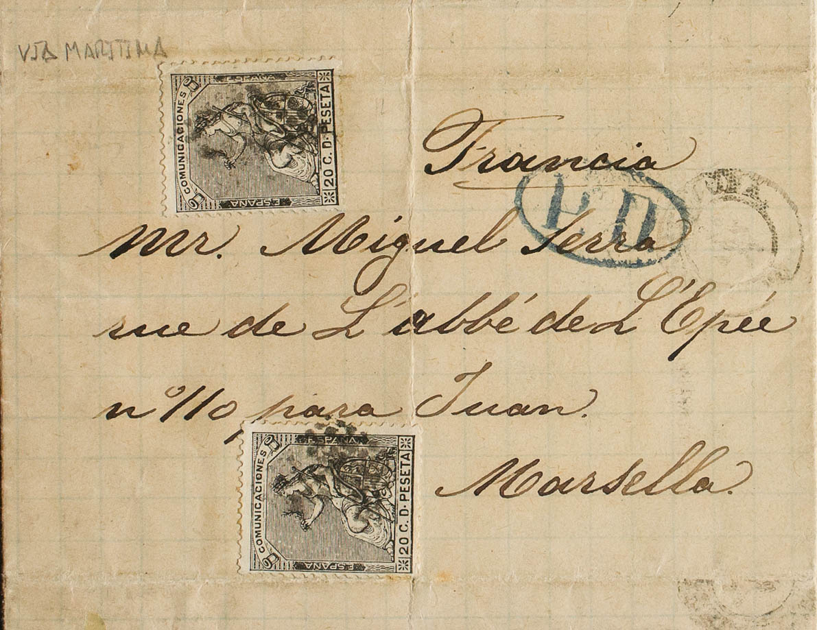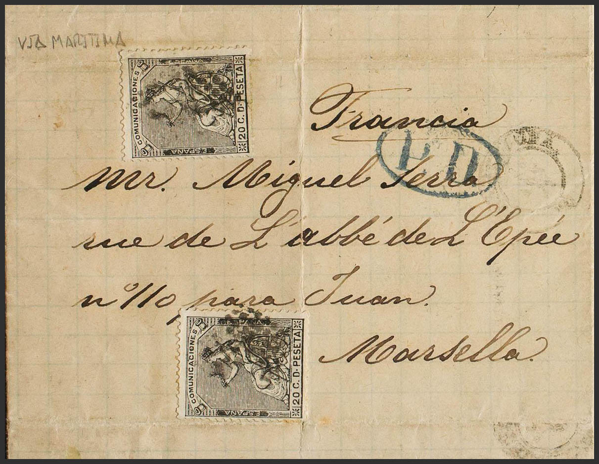 134(2). 1873. 20 cts negro, dos sellos. BARCELONA a MARSELLA (FRANCIA). MAGNIFICA E INUSUAL COMBINACION PARA COMPLETAR LA TARIFA DE 40 CTS A FRANCIA.