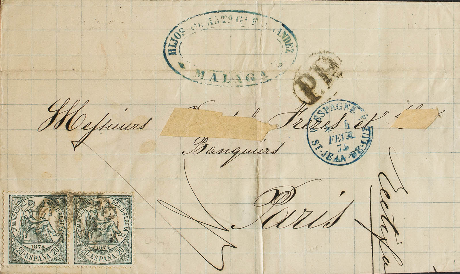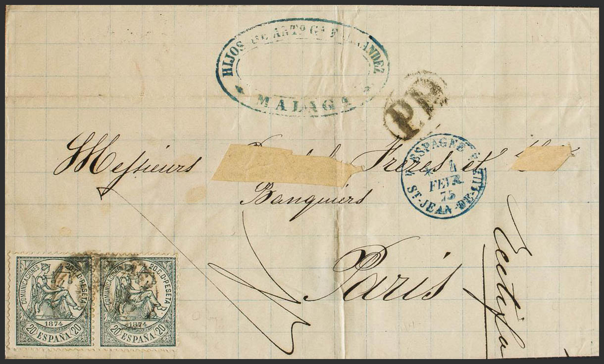 146(2). 1875. 20 cts verde, pareja. MALAGA a PARIS (FRANCIA) (dirección parcialmente recortada). BONITA Y RARA COMBINACION DE FRANQUEO PARA COMPLETAR LA TARIFA A FRANCIA DE 40 CTS, ESPECIALMENTE EN ESTA EMISION.