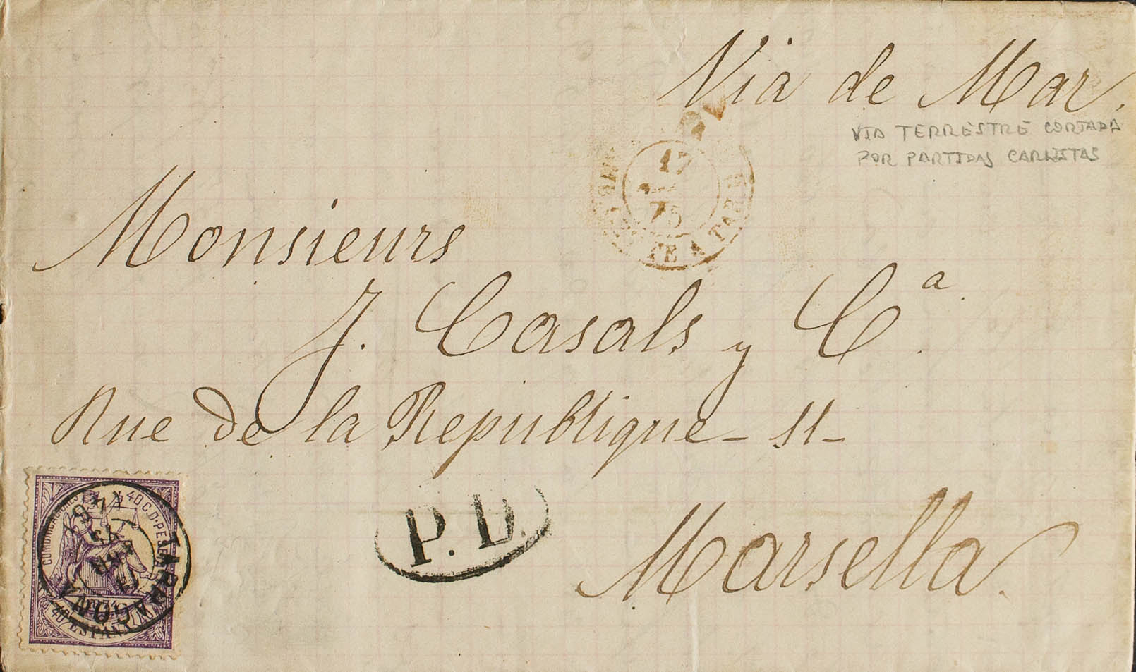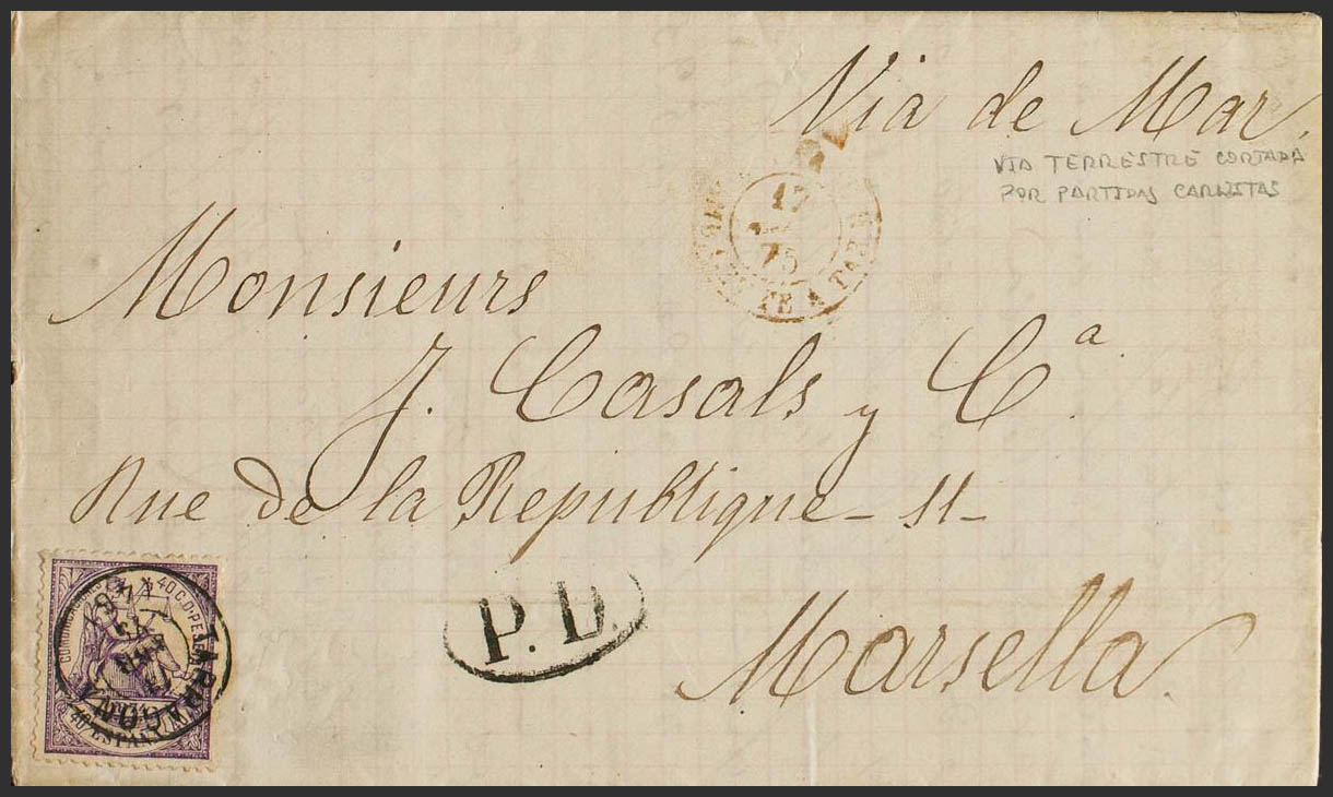 148. 1874. 40 cts violeta. TARRAGONA a MARSELLA. Matasello TARRAGONA / (46). MAGNIFICA Y ESPECTACULAR.