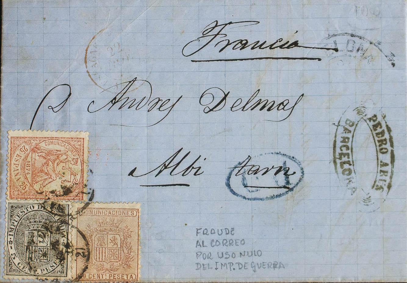 141, 147, 153. 1874. 5 cts negro, 25 cts castaño y 10 cts castaño. BARCELONA a ALBI (FRANCIA). MAGNIFICO FRANQUEO TRICOLOR Y RARISIMO USO DEL SELLO DE IMPUESTO DE GUERRA USADO COMO COMPLEMENTO DE LA TARIFA ORDINARIA, PROBABLEMENTE UNICA CONOCIDA.