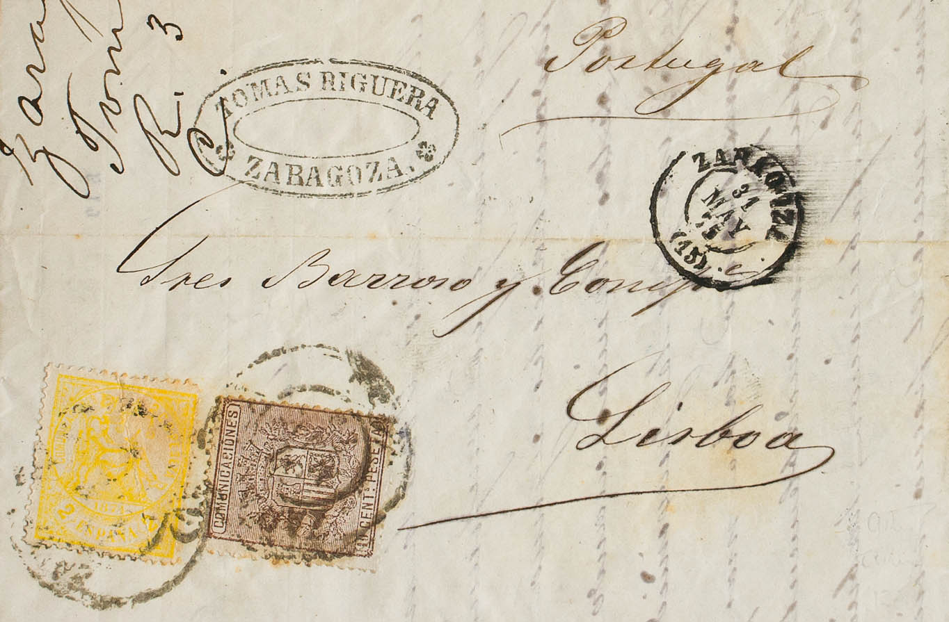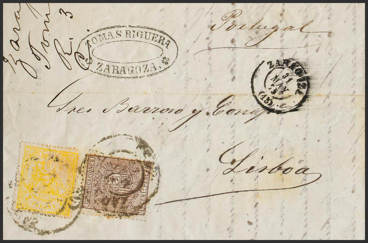 143, 153. 1875. 2 cts amarillo y 10 cts castaño. ZARAGOZA a LISBOA (PORTUGAL). Matasello ZARAGOZA / (15). MAGNIFICA Y RARISIMA COMBINACION PARA COMPLETAR LA TARIFA DE 12 CTS.