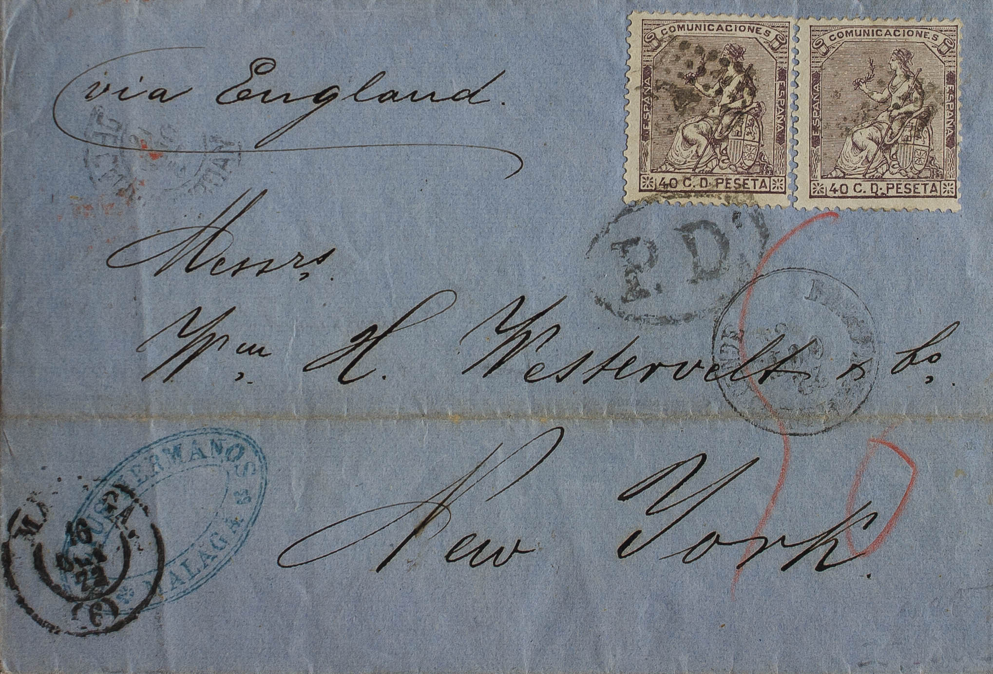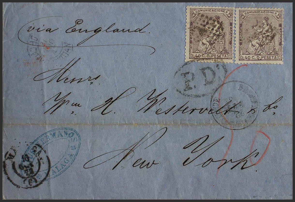 136(2). 1872. 40 cts castaño, dos sellos. MALAGA a NUEVA YORK (U.S.A.). En el frente fechador ETATS UNIS PAR OSTENDE. MAGNIFICA Y RARA TARIFA DE 80 CTS VIA BELGICA E INGLATERRA.