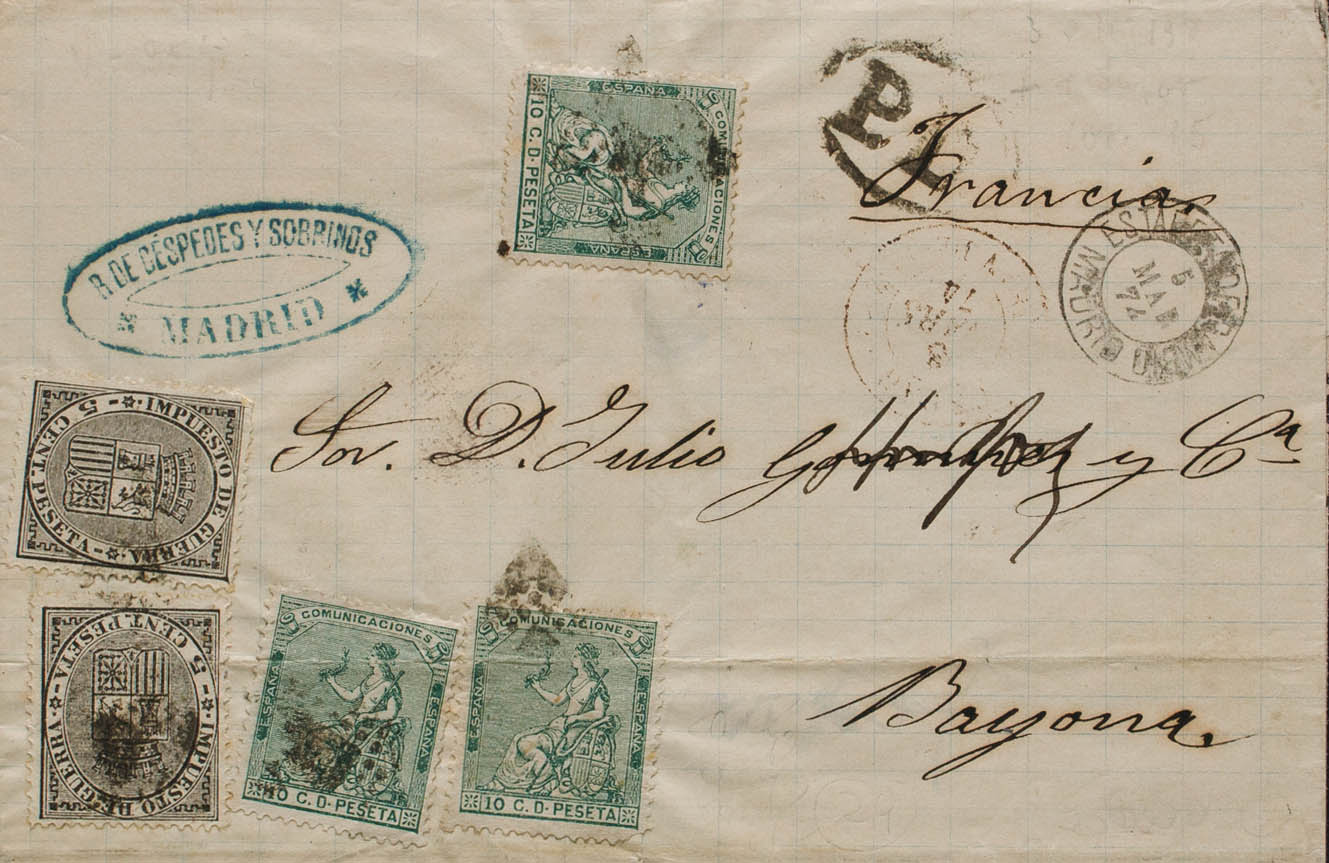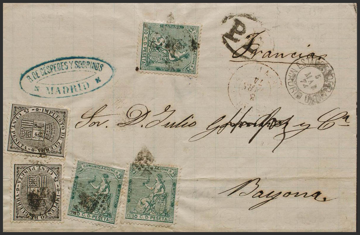 133(3), 141(2). 1874. 10 cts verde, tres sellos y 5 cts negro, dos sellos. MADRID a BAYONA (FRANCIA). Los sellos de Impuesto de Guerra son aplicados para completar la tarifa de 40 cts a Francia (doblez de archivo). MAGNIFICA Y RARISIMA COMBINACION DE FRANQUEO.