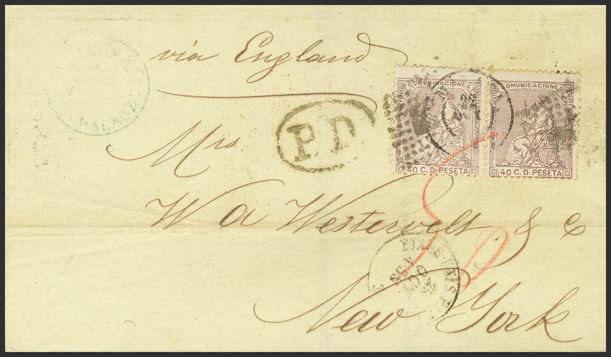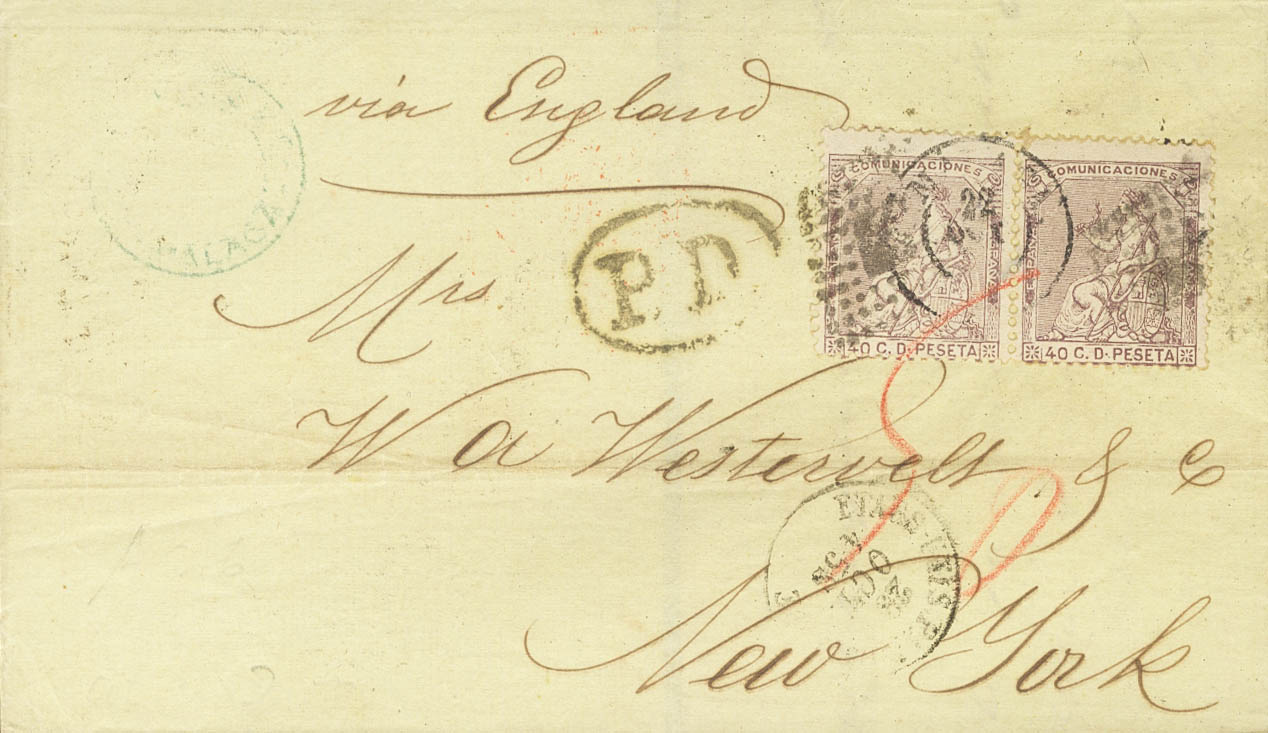136(2). 1873. 40 cts castaño violeta, pareja. MALAGA a NUEVA YORK (U.S.A.). En el frente fechador ETATS UNIS PAR OSTENDE. MAGNIFICA Y MUY RARA CIRCULADA POR LA VIA DE BELGICA.