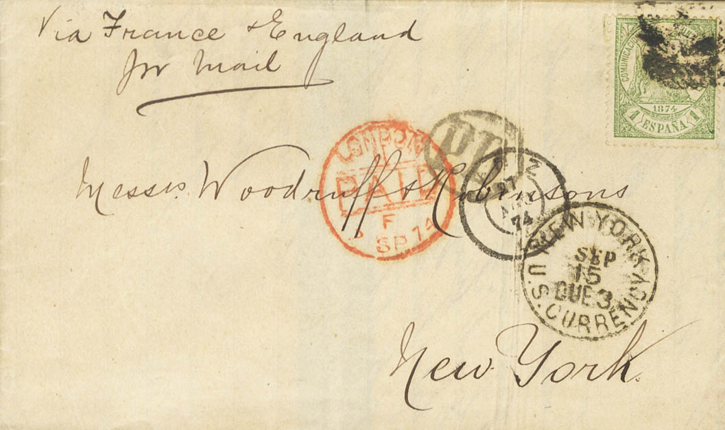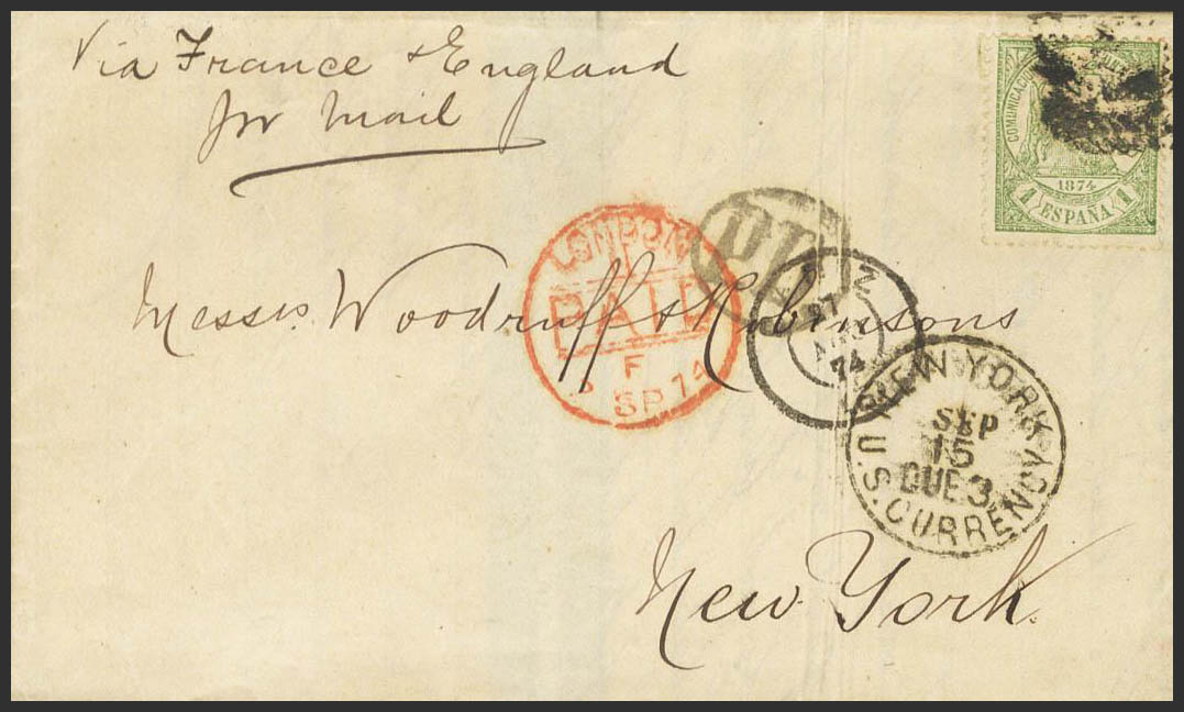 150. 1874. 1 pts verde. CADIZ a NUEVA YORK (U.S.A.). Circulada vía Inglaterra con franqueo en exceso de 20 cts según tarifa de Noviembre de 1872. MAGNIFICA Y RARISIMA EN ESTA EMISION CON DESTINO NUEVA YORK.