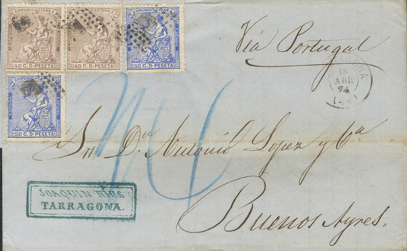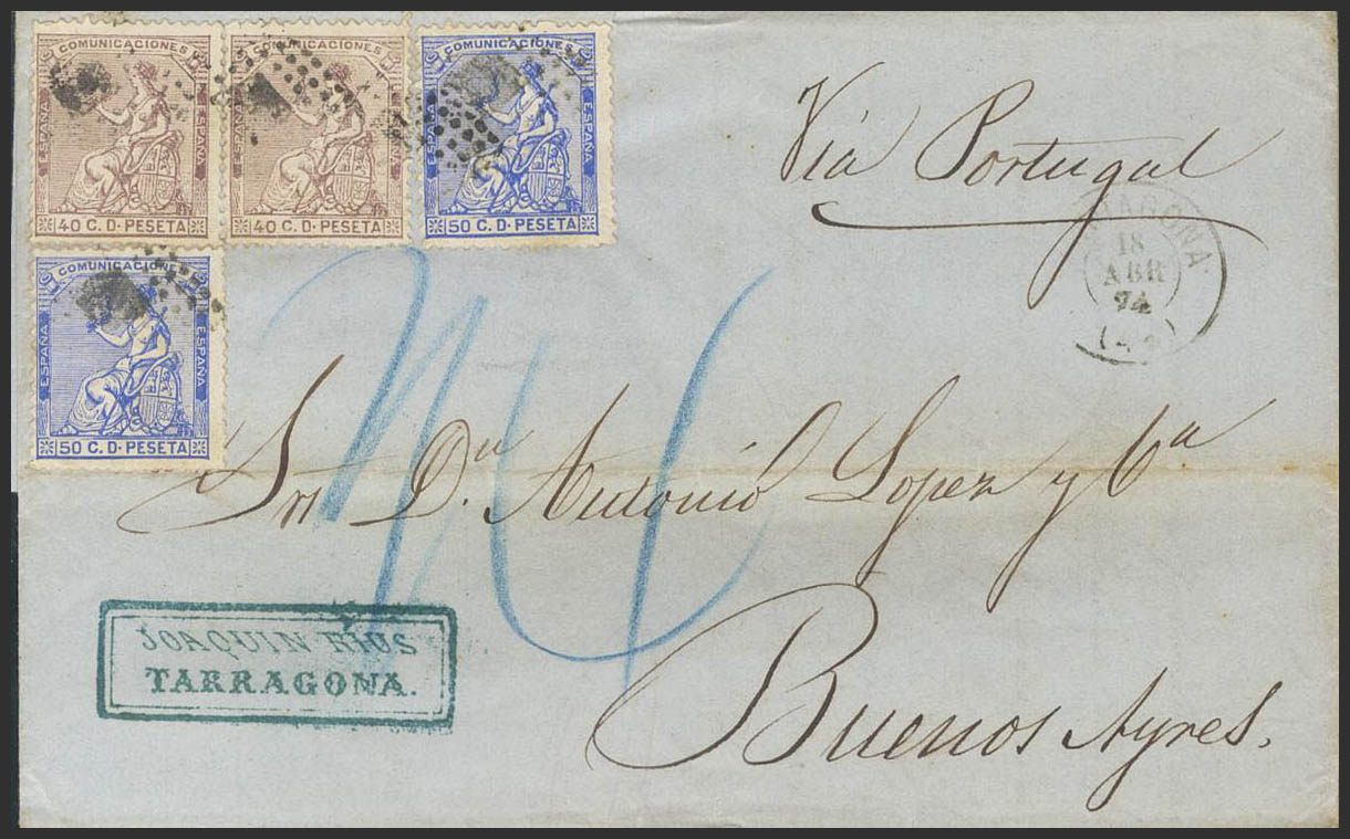 136(2), 137(2). 1874. 40 cts, dos sellos y 50 cts, dos sellos. TARRAGONA a BUENOS AIRES (ARGENTINA). MAGNIFICA E INUSUAL CARTA DE DOBLE PORTE POR LA VIA DE PORTUGAL CON EXCESO DE 6 CTS.