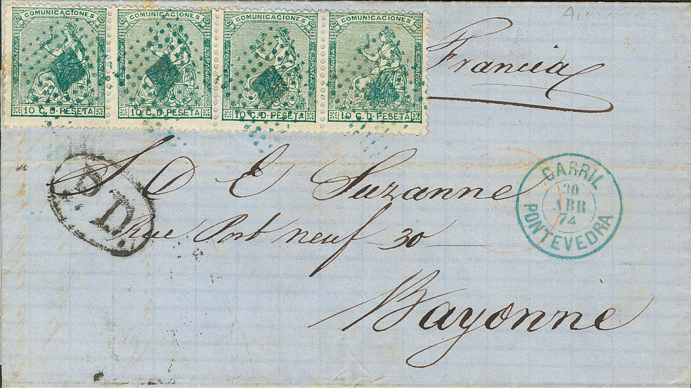 133(4). 1874. 10 cts verde, tira de cuatro. CARRIL (PONTEVEDRA) a BAYONA (FRANCIA). Matasello ROMBO DE PUNTOS, en azul. MAGNIFICA Y ESPECTACULAR PIEZA DE ENORME BELLEZA Y RAREZA.