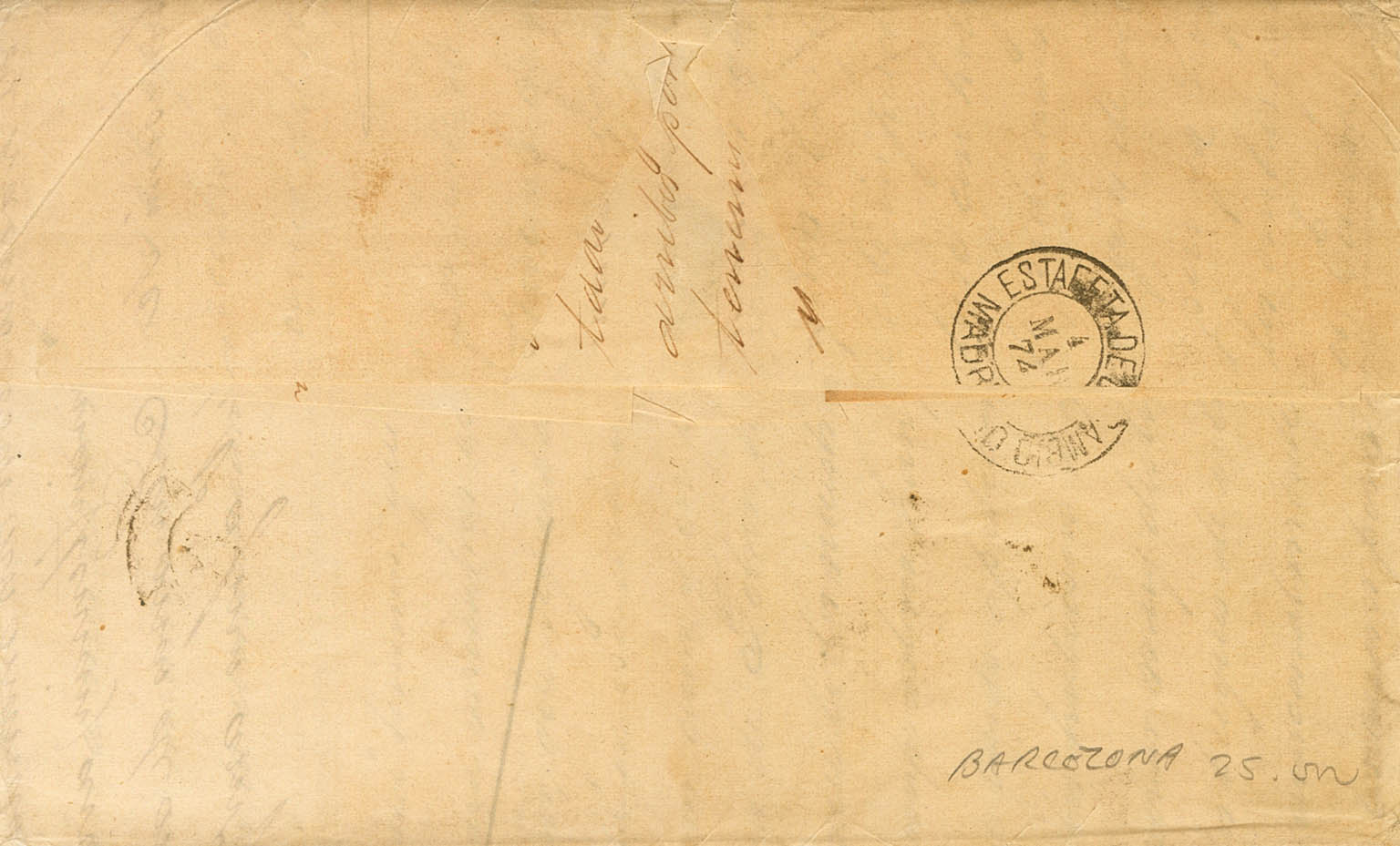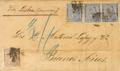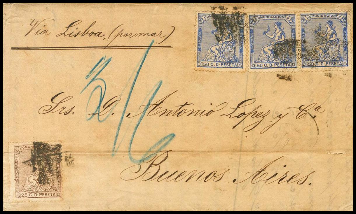135, 137(3). 1874. 25 cts y 50 cts, tres sellos. BARCELONA a BUENOS AIRES (ARGENTINA). MAGNIFICA E INUSUAL CARTA DE DOBLE PORTE POR LA VIA DE PORTUGAL CON EXCESO DE 1 CTS.