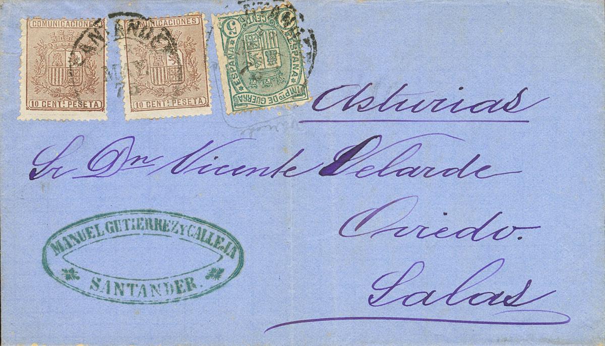 153(2), 154. 1875. 10 cts castaño, dos sellos y 5 cts verde. SANTANDER a SALAS (ASTURIAS). MAGNIFICA.
