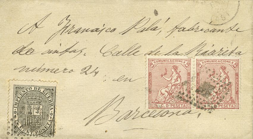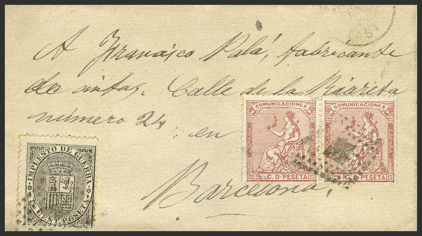 132(2), 141. (1874ca). 5 cts rosa, pareja y 5 cts negro. Dirigida a BARCELONA. MAGNIFICA.