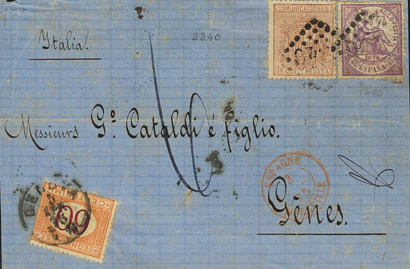 148, 153. 1875. 40 cts violeta, 10 cts castaño y tasa italiana de 60 cts. Frontal dirigido a GENOVA (ITALIA). Matasello ROMBO DE PUNTOS Nº2240, de Marsella aplicado en tránsito. MAGNIFICO Y RARO.