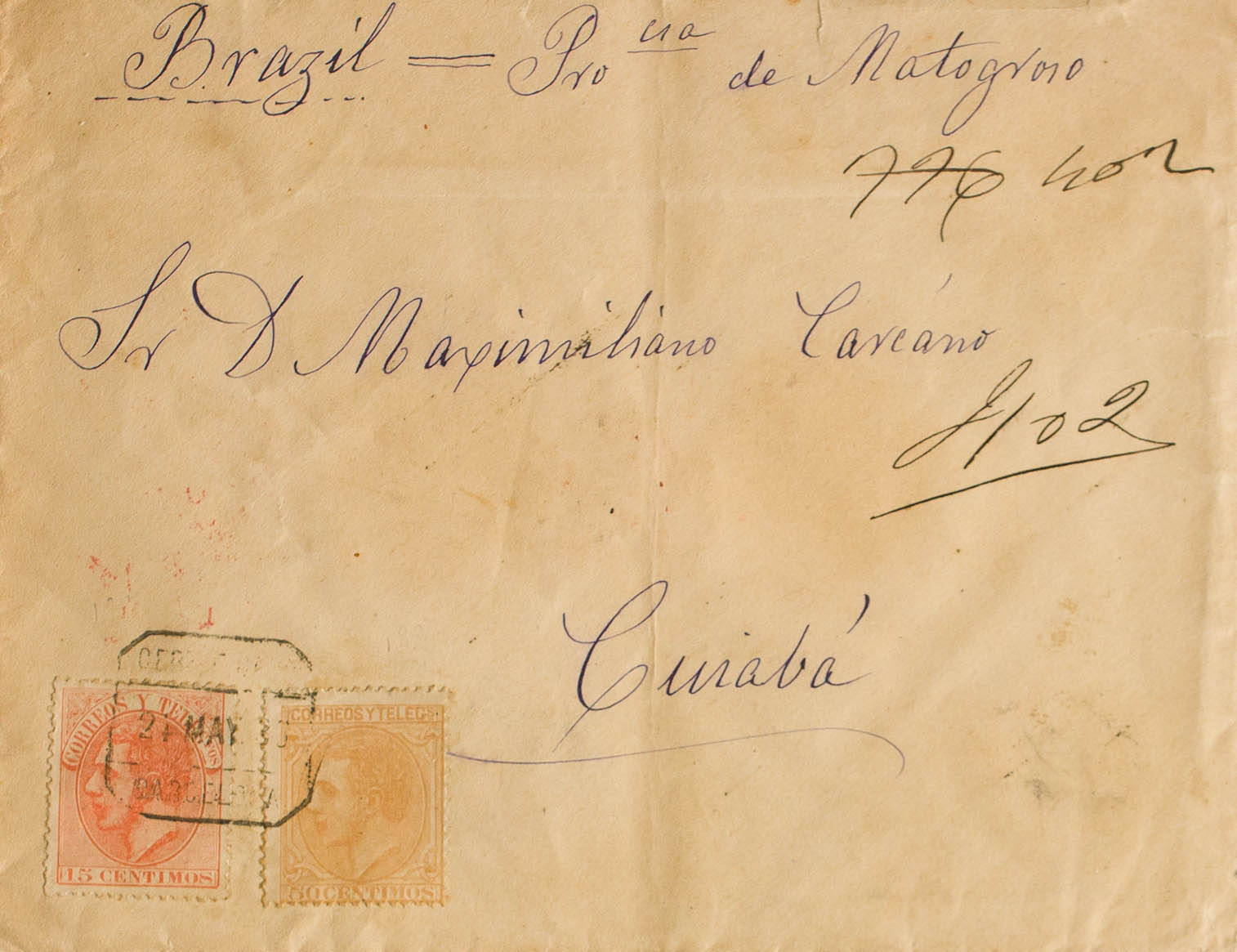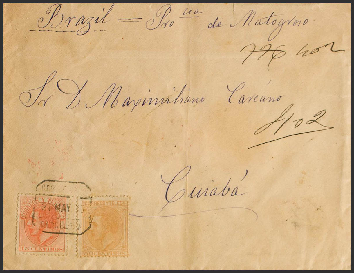 206, 210. 1885. 50 cts naranja y 15 cts naranja. Certificado de BARCELONA a CUYABA (BRASIL). Circulaba vÃa Badajoz y Lisboa. MAGNIFICA Y RARA.