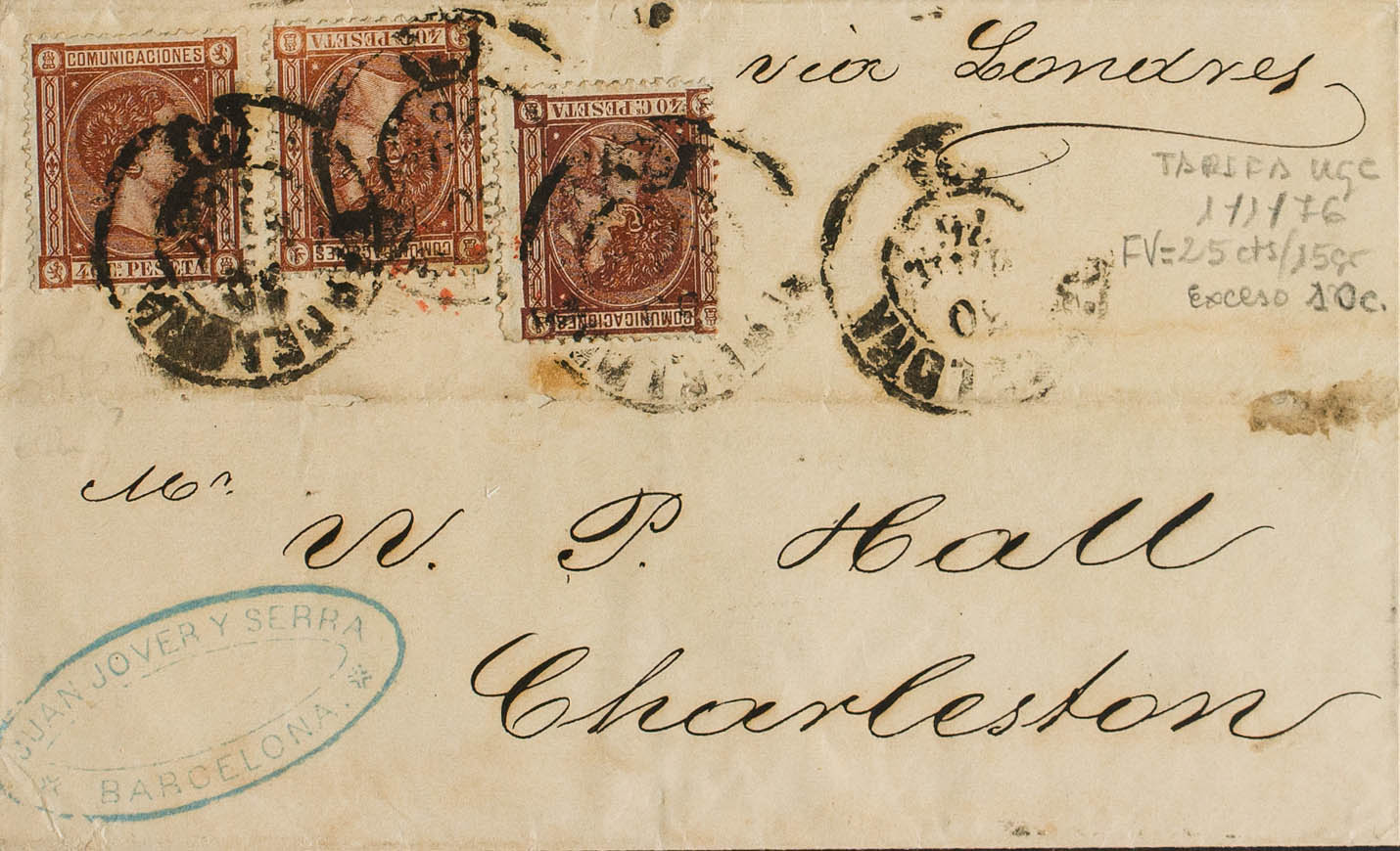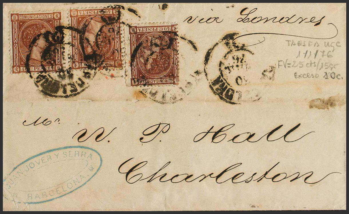 167(3). 1876. 40 cts castaño, tres sellos. BARCELONA a CHARLESTON (U.S.A.). MAGNIFICA Y MUY RARO FRANQUEO DE CUATRO PORTES CON EXCESO DE 20 CTS.