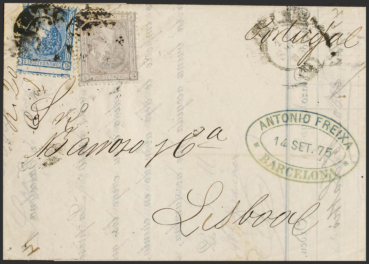 163, 164. 1875. 5 cts lila y 10 cts azul. BARCELONA a LISBOA (PORTUGAL). Franqueo con exceso de 5 cts según nuevas tarifas en vigor desde Julio de 1875. MAGNIFICA E INUSUAL COMBINACION DE FRANQUEO.