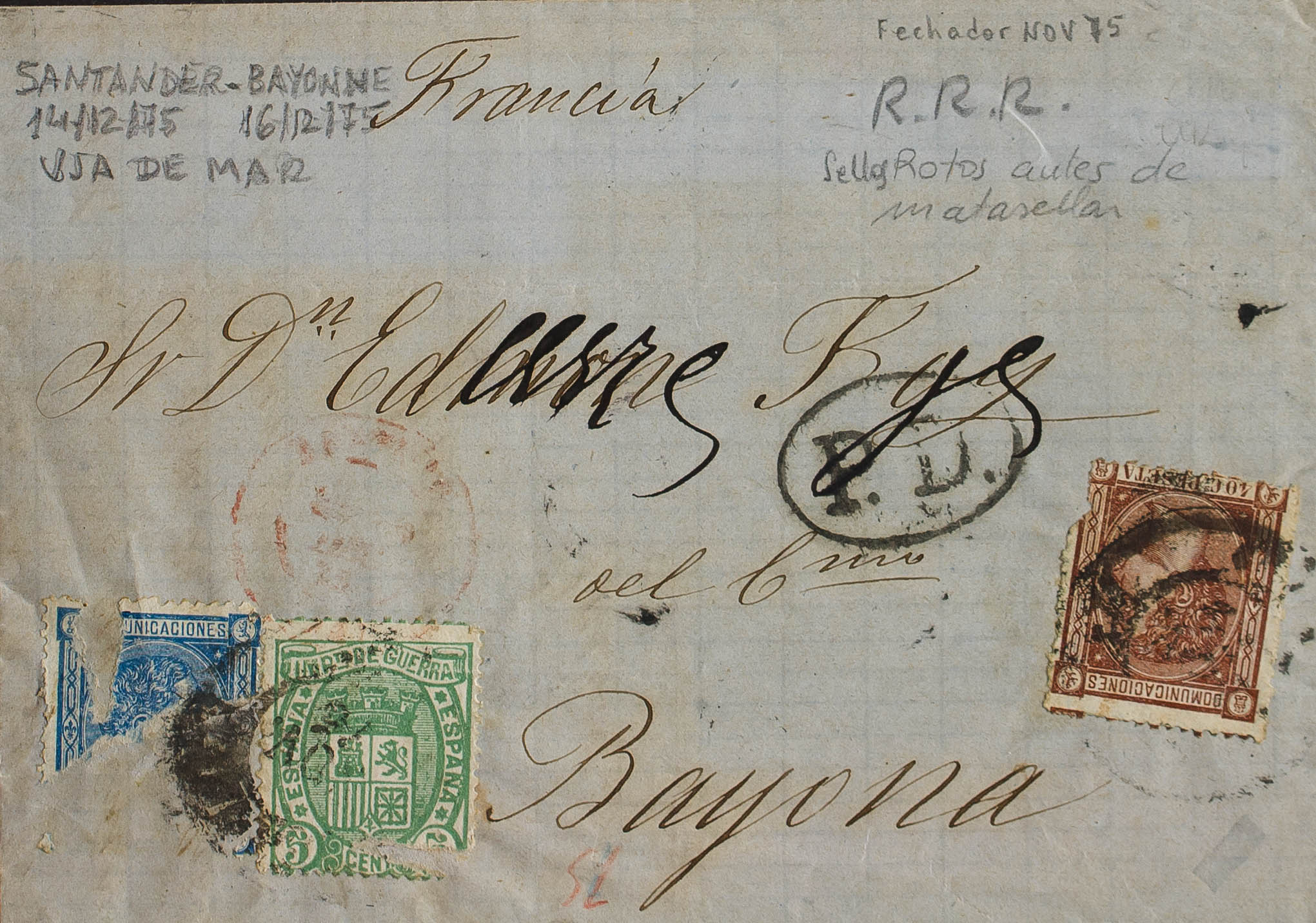 154, 164, 167. 1875. 5 cts verde, 10 cts azul y 40 cts castaño (con defectos antes de su cancelación, contraviniendo las normas postales). SANTANDER a BAYONA (FRANCIA), circulada por vía marítima. MAGNIFICA Y RARISIMA CARTA NO TASADA CON LOS SELLOS DEFECTUOSOS EN ORIGEN.