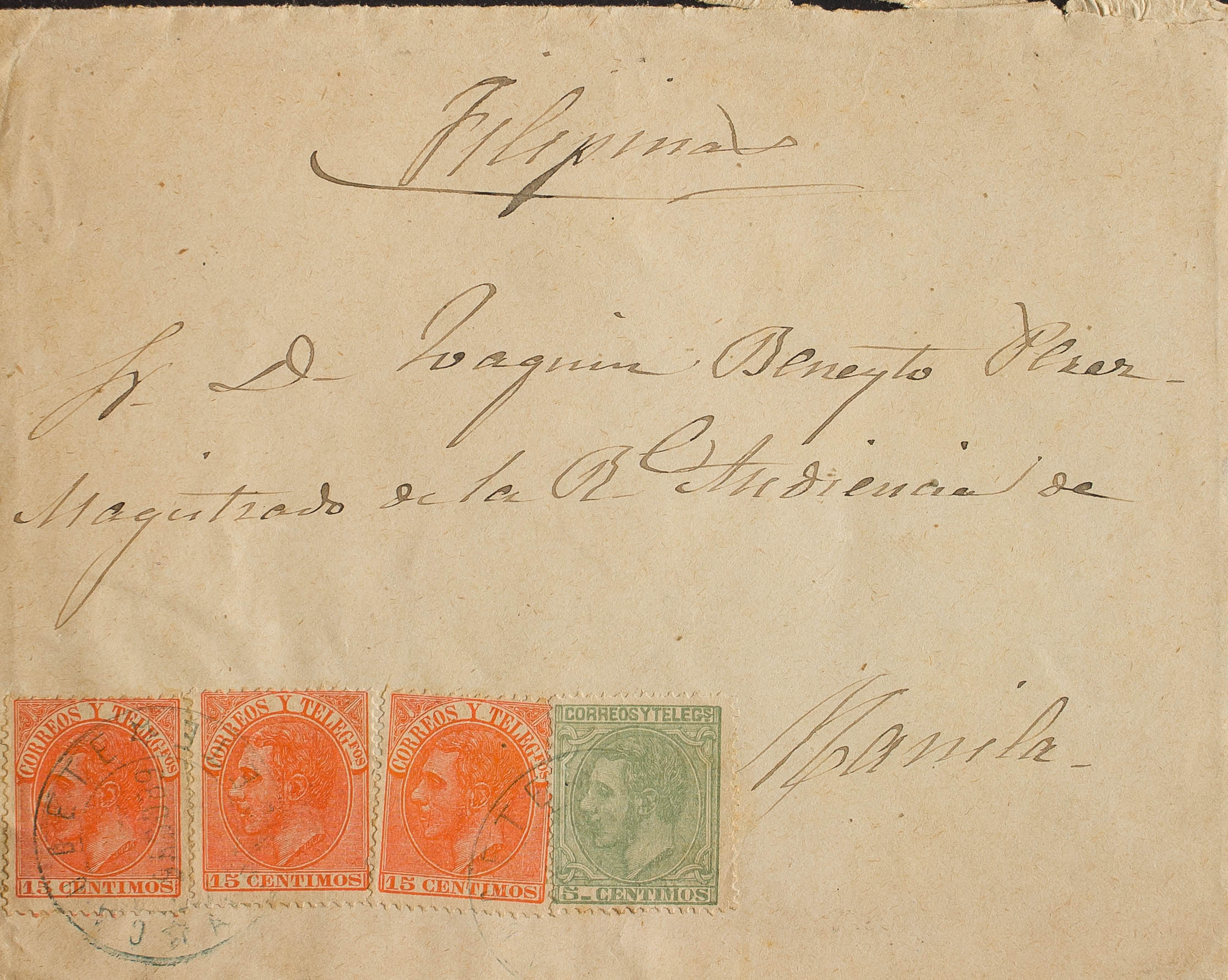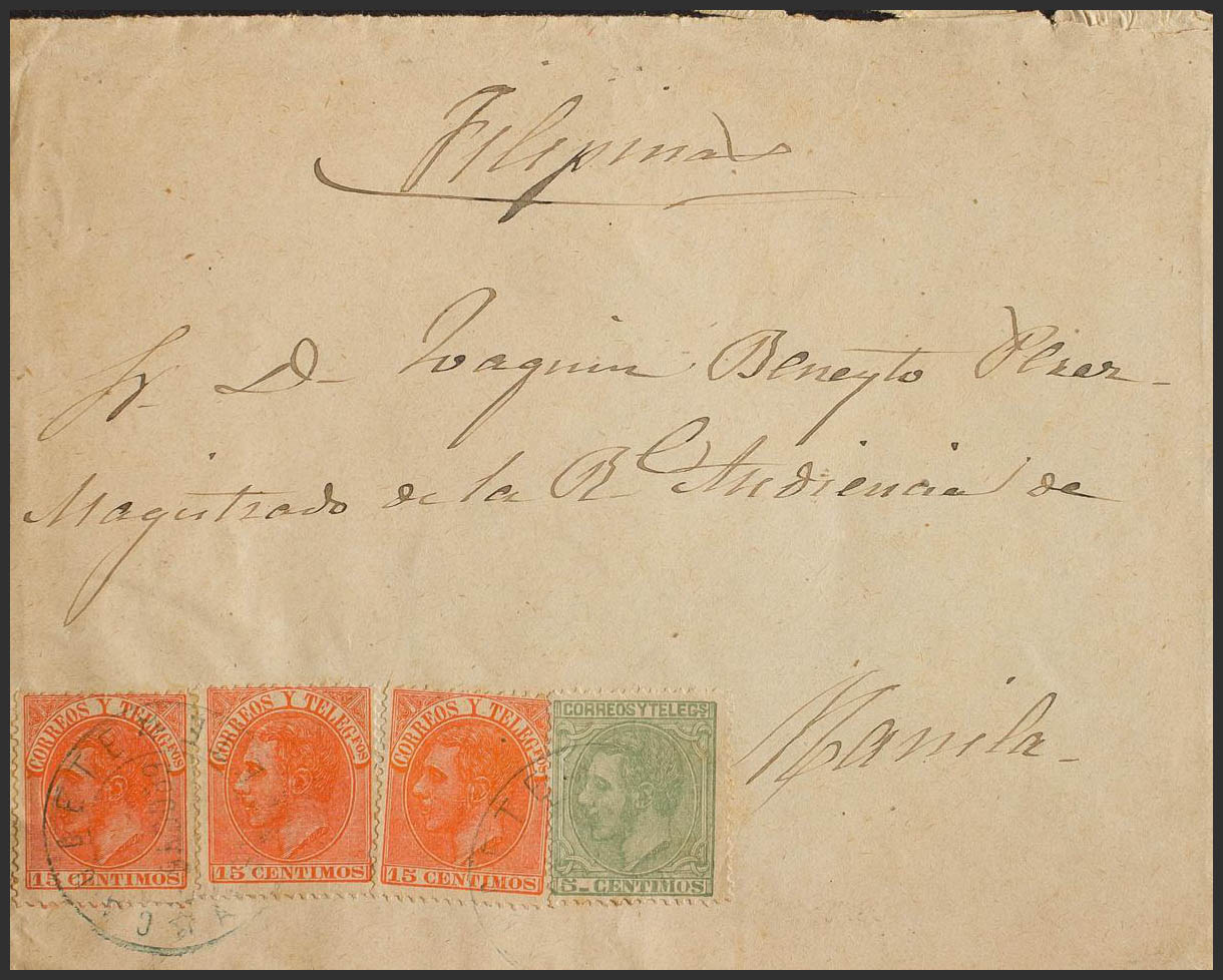 201, 210(3). 1889. 5 cts verde y 15 cts naranja, tres sellos. CAUDETE a MANILA (FILIPINAS). Matasello CAUDETE / ALBACETE, en azul. MAGNIFICA Y RARO DESTINO A FILIPINAS.
