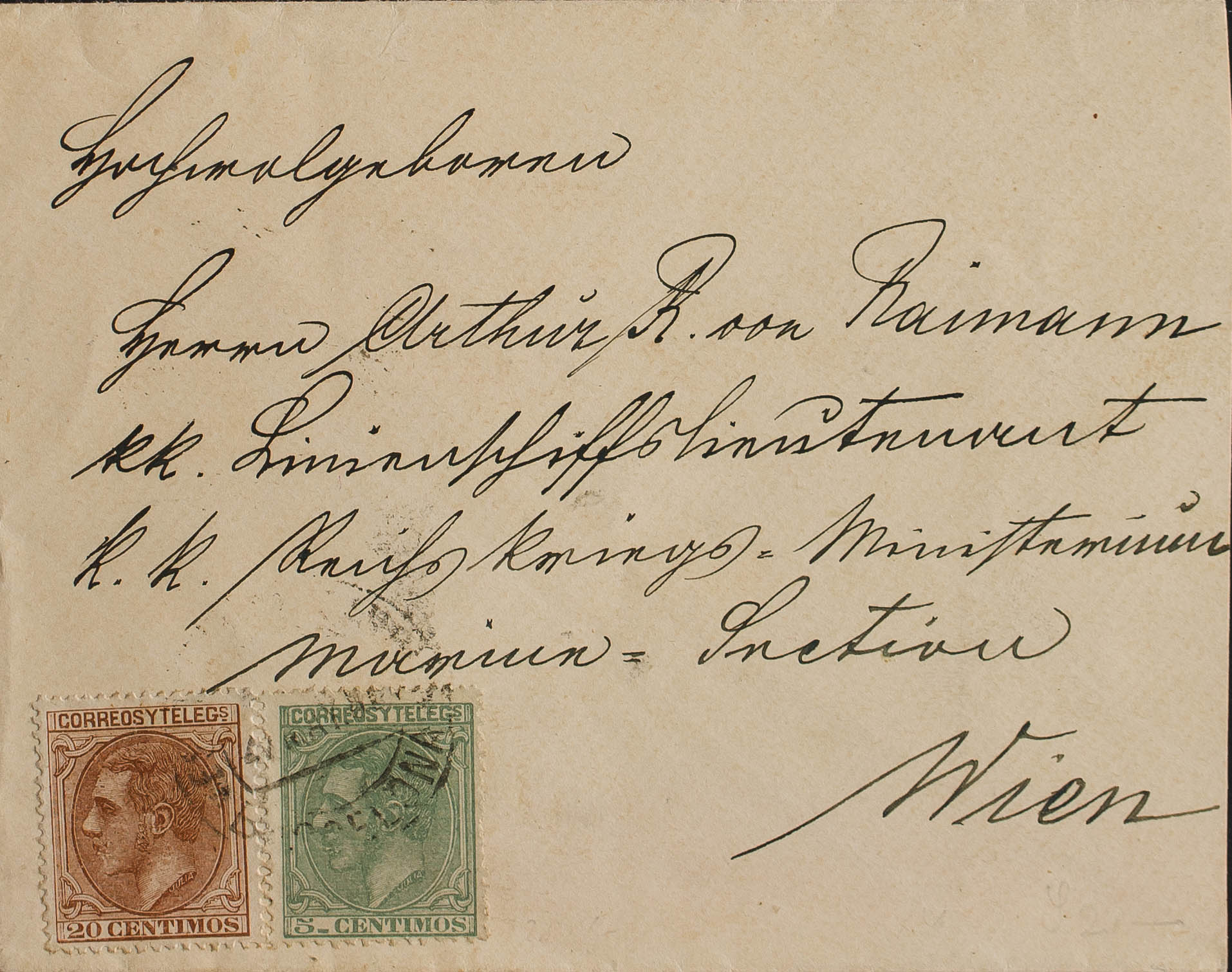 203, 201. 1888. 20 cts y 5 cts. BARCELONA a VIENA (AUSTRIA). MAGNIFICA Y RARISIMA COMBINACION PARA COMPONER LA TARIFA DE 25 CTS A AUSTRIA.