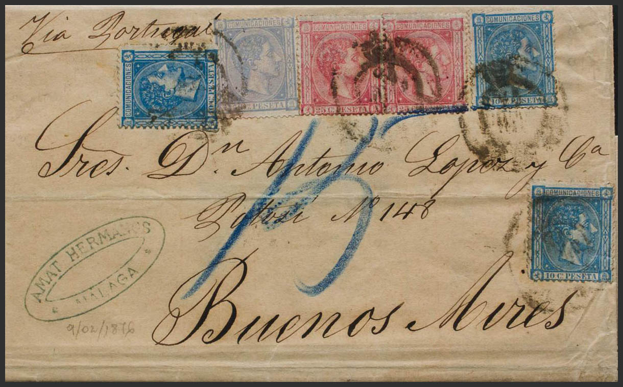 164(3), 166(2), 168. 1876. 10 cts azul, tres sellos, 25 cts rosa, dos sellos y 50 cts lila. MALAGA a BUENOS AIRES (ARGENTINA), circulada vÃa Portugal con franqueo insuficiente para doble porte, por lo que es tasada con "15" (décimas) el franqueo 1´30 pts, corresponde a la vÃa Barcelona y Gibraltar, se observa además por no tener tránsito por Badajoz o Lisboa. MAGNIFICA Y ESPECTACULAR FRANQUEO, PROBABLEMENTE UNICA CONOCIDA.