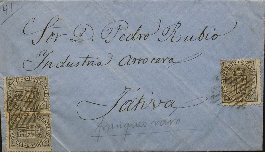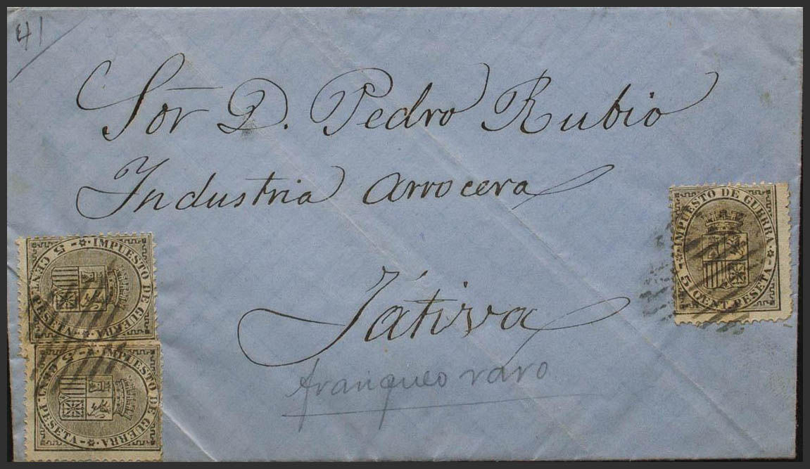 141(3). 1874. 5 cts negro, tres sellos. Dirigida a JATIVA. Matasello REJILLA. MAGNIFICA E INUSUAL FRANQUEO CON SELLOS DE IMPUESTO DE GUERRA.