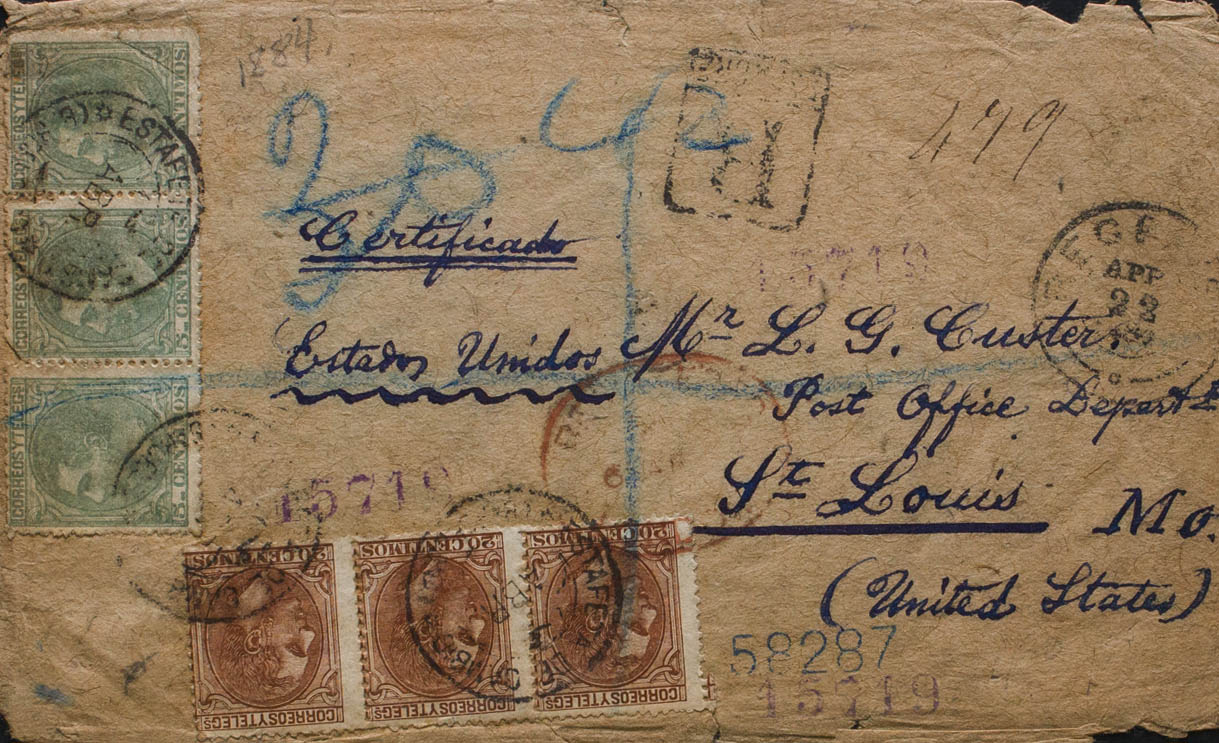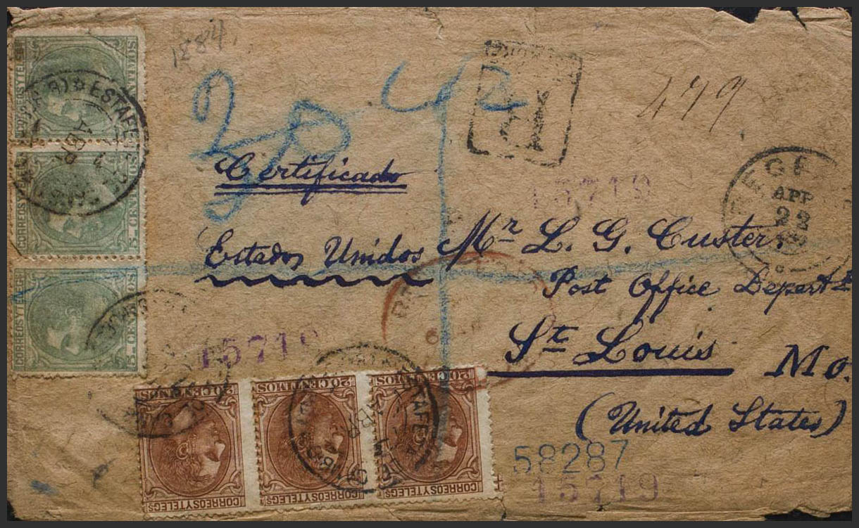 201(3), 203(3). 1884. 5 cts verde, tira de tres y 20 cts castaño rojo, tira de tres. Certificado de BARCELONA a SAN LUIS (U.S.A.) (ciertas erosiones de poca importancia). MAGNIFICA E INUSUAL FRANQUEO DE DOBLE PORTE POR LA VIA DE INGLATERRA.