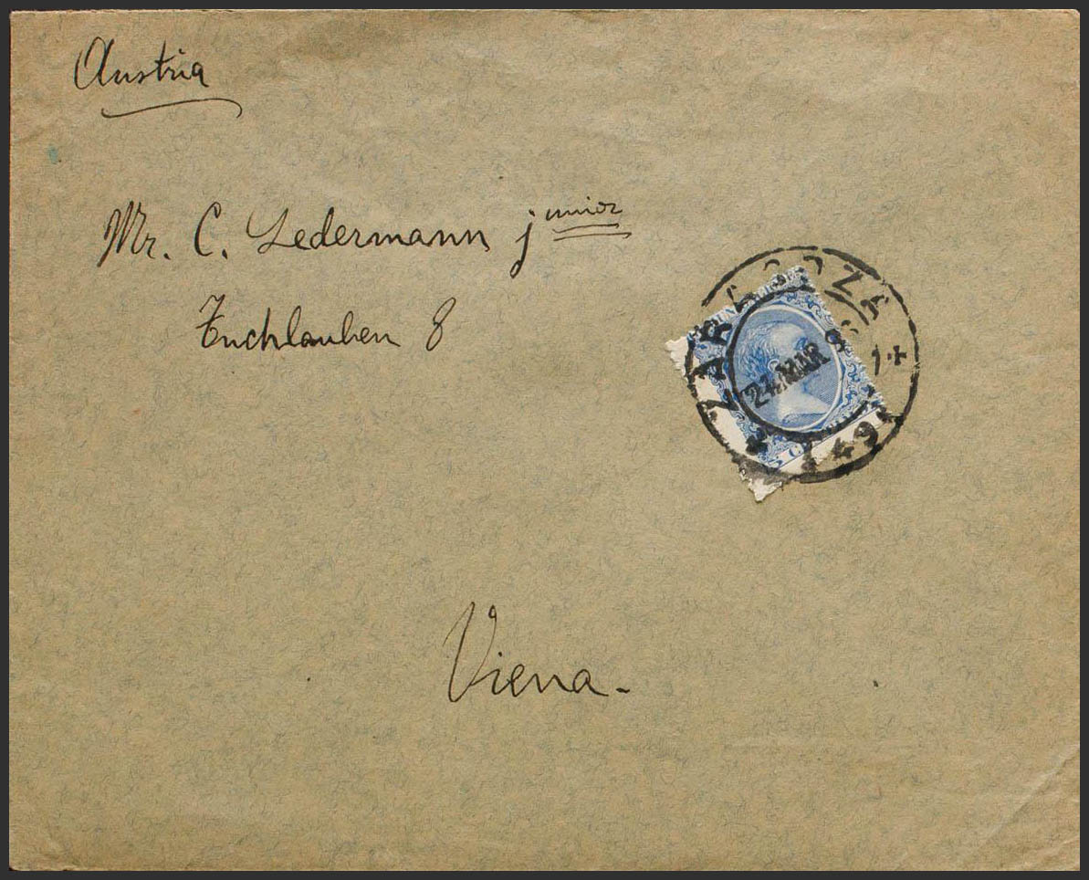 215. 1896. 5 cts azul. Impreso de ZARAGOZA a VIENA (AUSTRIA). MAGNIFICA Y RARA.